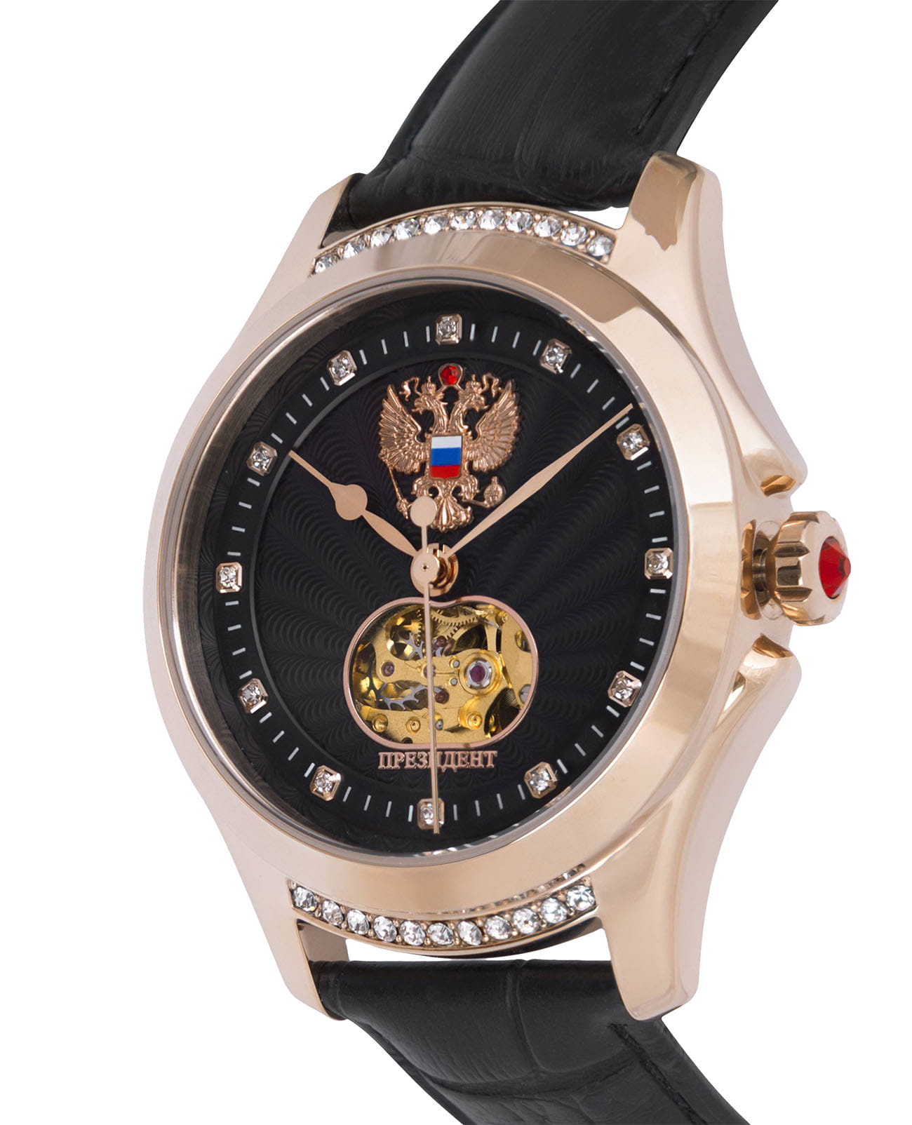 Стильные элегантные часы «Президент» — это идеальное дополнение к образу уверенной и целеустремлённой женщины. Модель выполнена в круглой форме с корпусом диаметром 39 мм и толщиной 11 мм, украшенным розовым золотом18-каратное золотоОбозначение по каратной системе пробирования, оно показывает, сколько драгоценного металла содержится в изделии. 18 карат - в составе 75% чистого золота, соответствует 750 пробе.