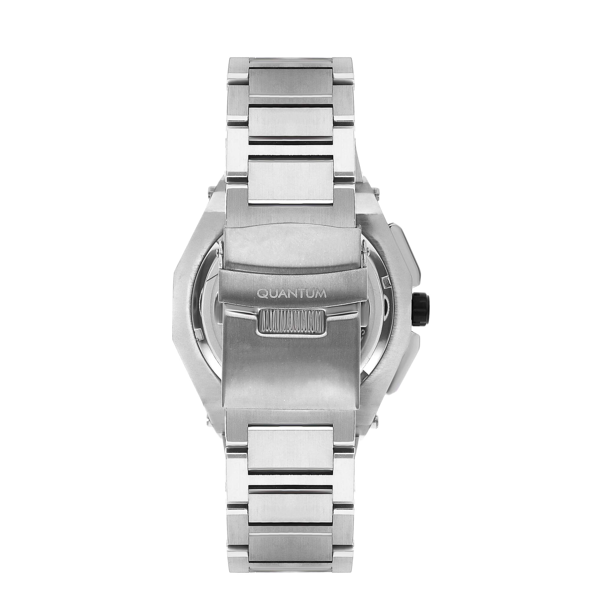 Мужские наручные часы-хронографХронографФункция позволяет измерять отрезки времени с особой точностью: часы, минуты, секунды. Верным признаком хронографа является наличие на циферблате 3 дополнительных окошек-счётчиков. Quantum HNG1011.370, кварцевый механизм с высокой точностью. Класс водозащиты: 100 метров, позволит плавать, нырять и заниматься другими водными видами спорта. Корпус часов изготовлен из нержавеющей стали. Стрелки с люминесцентным покрытиемЛюминесцентное покрытиеПозволяет считывать показания времени в темноте. Производители наносят на стрелки, часовые индексы, безель или поверхность циферблата светонакопительный состав, дающий холодное свечение.. Стальной браслет на раскладной застёжкеРаскладная застёжкаТакой тип застёжки используется только на браслетах из металла. Она никогда не раскрывается полностью, происходит разделение на 2 и более частей. Раскладывающая застёжка снизит вероятность потери часов к минимуму..