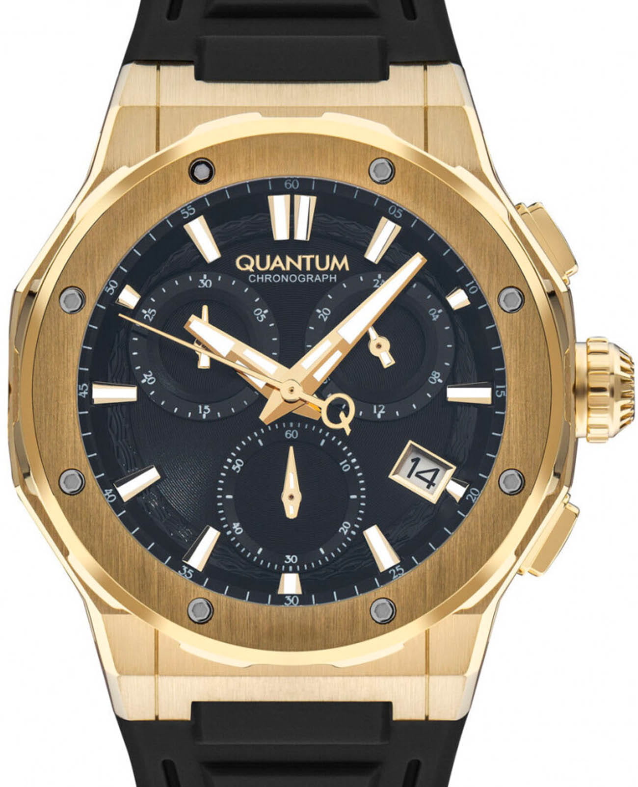 Мужские кварцевые часы Quantum HNG1082.251 из коллекции Hunter — круглый корпус размером 46 мм из нержавеющей стали с PVD-покрытиемPVDУльтратонкое покрытие наносится в технике вакуумного напыления, сочетает в себе нитрид титана особой прочности со слоем золота или оксида хрома. Несёт в себе декоративную или защитную функцию., оснащённый функциями хронографаХронографФункция позволяет измерять отрезки времени с особой точностью: часы, минуты, секунды. Верным признаком хронографа является наличие на циферблате 3 дополнительных окошек-счётчиков., секундомера и окошком даты. Стекло — минеральноеМинеральное стеклоМинеральное стекло представляет собой искусственно выращенный минерал кварца. Такое стекло отличается особой устойчивостью к повреждениям и царапинам. Уступает по некоторым качествам сапфировому стеклу. с антибликовым покрытием. Механизм — кварцевый. Водонепроницаемость 100 м. Задняя крышка завинчивающаяся. Ремешок чёрный силиконовый на стандартной застёжке. Идеальный выбор для тех, кто ценит турецкий дизайн и функциональный спортивный стиль.