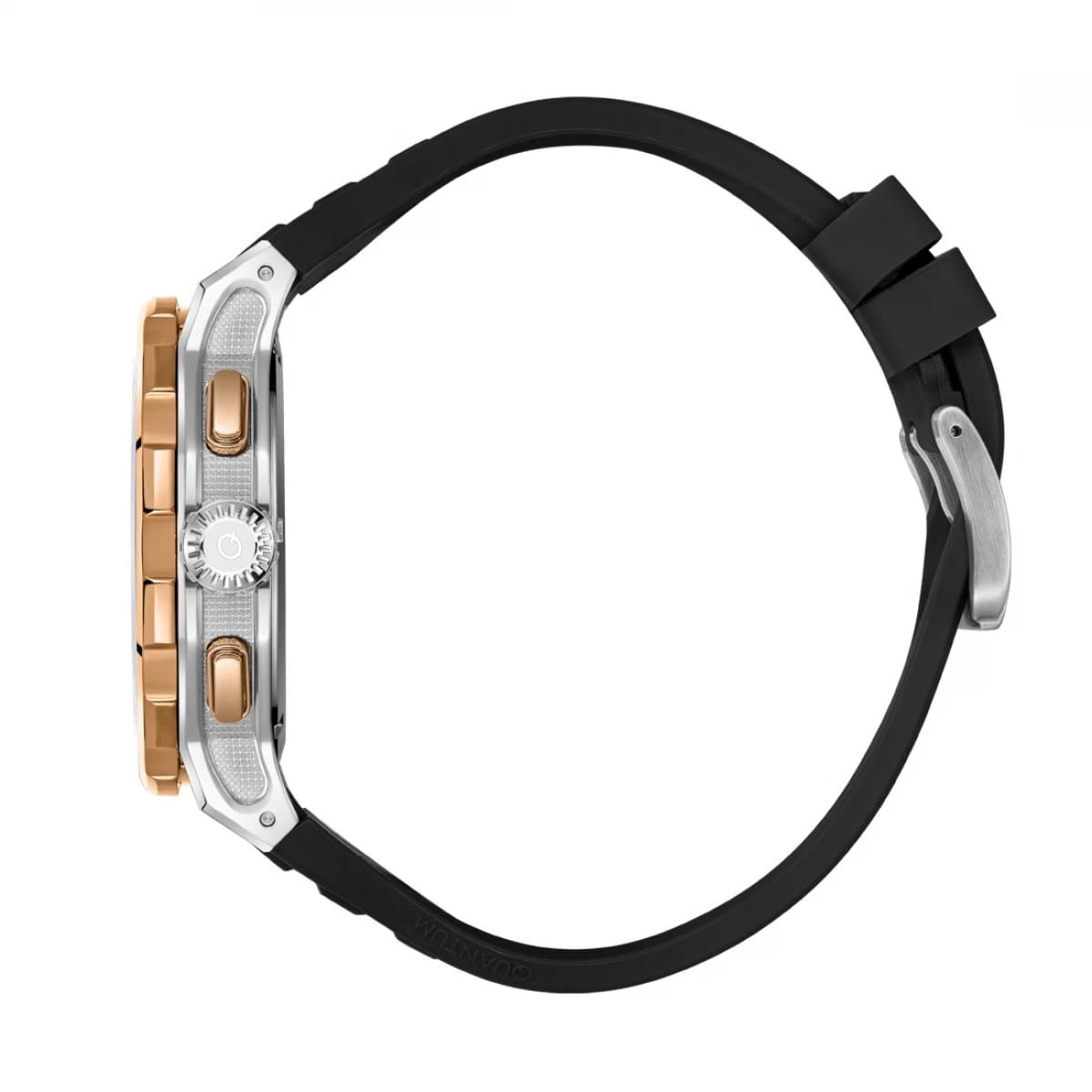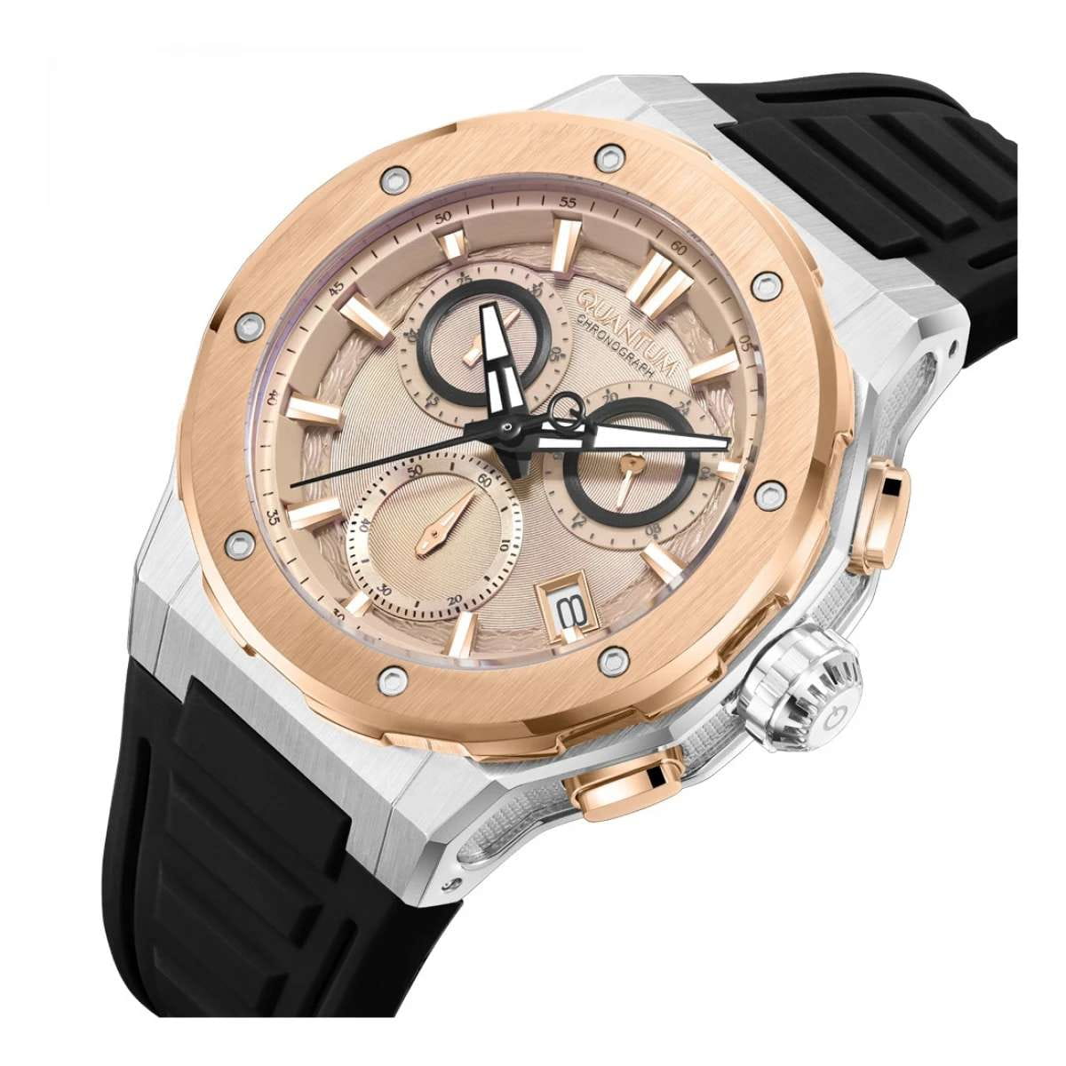 Мужские кварцевые часы Quantum HNG1082.571 из коллекции Hunter — круглый корпус размером 46 мм из нержавеющей стали. БезельБезельВнешний ободок, закрепляющий стекло. В спортивных часах так называется поворотное кольцо с делениями на циферблате, выполняет роль таймера – замеряет отрезки времени на шкале. Неподвижный безель – элемент декора. Однонаправленно вращающийся безель на дайверских часах позволяет фиксировать моменты погружения и выныривания на поверхность. с PVD-покрытиемPVDУльтратонкое покрытие наносится в технике вакуумного напыления, сочетает в себе нитрид титана особой прочности со слоем золота или оксида хрома. Несёт в себе декоративную или защитную функцию. и функциями хронографаХронографФункция позволяет измерять отрезки времени с особой точностью: часы, минуты, секунды. Верным признаком хронографа является наличие на циферблате 3 дополнительных окошек-счётчиков. и окошка даты. Стекло — минеральноеМинеральное стеклоМинеральное стекло представляет собой искусственно выращенный минерал кварца. Такое стекло отличается особой устойчивостью к повреждениям и царапинам. Уступает по некоторым качествам сапфировому стеклу. с антибликовым покрытием. Стрелки с люминесцентным покрытиемЛюминесцентное покрытиеПозволяет считывать показания времени в темноте. Производители наносят на стрелки, часовые индексы, безель или поверхность циферблата светонакопительный состав, дающий холодное свечение.. Механизм — японский кварцевый Seiko. Водонепроницаемость 100 м. Ремешок — чёрный силиконовый на стандартной застёжке. Идеальный выбор для тех, кто ценит турецкий дизайн и спортивно-повседневный стиль.