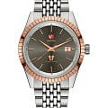Премиальная модель стала современной интерпретацией знаковой линейки 1957 года, воплощающей ретро-элементы в новом формате. Циферблат в лаконичном исполнении дополнен фирменными логотипами. Часы выполнены из долговечной стали 316L, исключением стал фигурный безельБезельВнешний ободок, закрепляющий стекло. В спортивных часах так называется поворотное кольцо с делениями на циферблате, выполняет роль таймера – замеряет отрезки времени на шкале. Неподвижный безель – элемент декора. Однонаправленно вращающийся безель на дайверских часах позволяет фиксировать моменты погружения и выныривания на поверхность. из сплава Ceramos™CeramosМатериал являет собой инновационное сочетание высокотехнологичной керамики и сплава металла. Он объединяет керамическую устойчивость к царапинам и металлический роскошный блеск. . Автоматический калибр ETA C07.611 швейцарского производства с запасом хода на 80 часов. Для защиты циферблата и прозрачной задней крышки выбрано сапфировое стекло. Водонепроницаемость WR 50. Браслет с . Прямоугольная апертура даты. Диаметр корпуса: 41,8 мм.