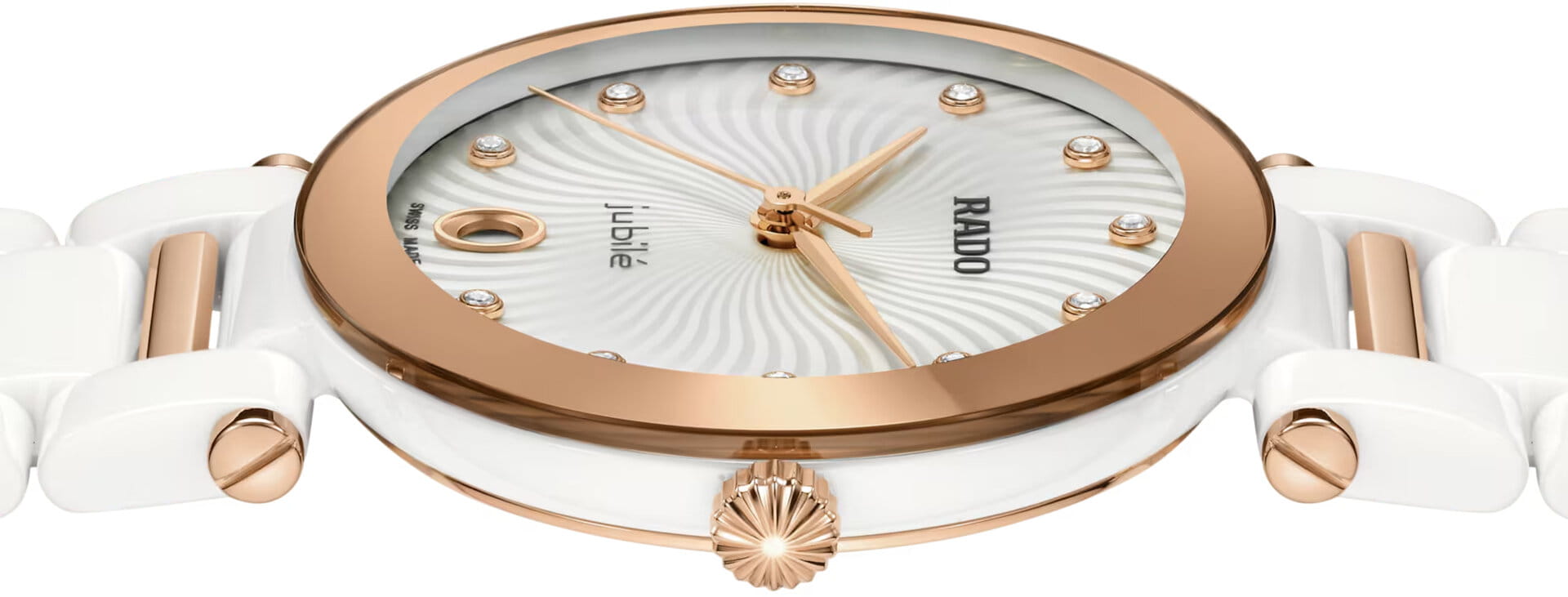 Женские кварцевые часы Rado — это изысканный аксессуар с современным дизайном. Корпус диаметром 31 мм выполнен из высокотехнологичной керамикиВысокотехнологичная керамикаИнновационный запатентованный Rado материал с гладкой или матовой поверхностью. Керамика за счёт кристаллической структуры обладает повышенной устойчивостью от возникновения царапин. Материал способен принимать температуру тела человека, обеспечивая невероятный комфорт при ношении. и нержавеющей стали с PVD-покрытиемPVDУльтратонкое покрытие наносится в технике вакуумного напыления, сочетает в себе нитрид титана особой прочности со слоем золота или оксида хрома. Несёт в себе декоративную или защитную функцию. розового золота. Циферблат белого цвета оформлен аналоговым дисплеем. Циферблат защищён выпуклым сапфировым стекломСапфировое стеклоПрочный и надёжный материал из кристалла сапфира синтетического происхождения, характеризующийся особой твёрдостью и устойчивостью к царапинам и повреждениям.. Окошко даты расположено в положении 3 часов. Механизм — кварцевый. Часы оснащены браслетом из комбинации керамики и стали с PVD-покрытиемPVDУльтратонкое покрытие наносится в технике вакуумного напыления, сочетает в себе нитрид титана особой прочности со слоем золота или оксида хрома. Несёт в себе декоративную или защитную функцию. и застёжкой «бабочка» с кнопкамиЗастёжка "бабочка"Такой вид застёжки дополняется предохранителями, помогающими избежать случайного раскрытия браслета. Обладают изящным исполнением. . Водонепроницаемость 50 м позволяет использовать часы в повседневных условиях. Гарантия — 5 лет на механизм, 2 года на изделие. Идеальный выбор для тех, кто ценит стиль, качество и универсальность.
