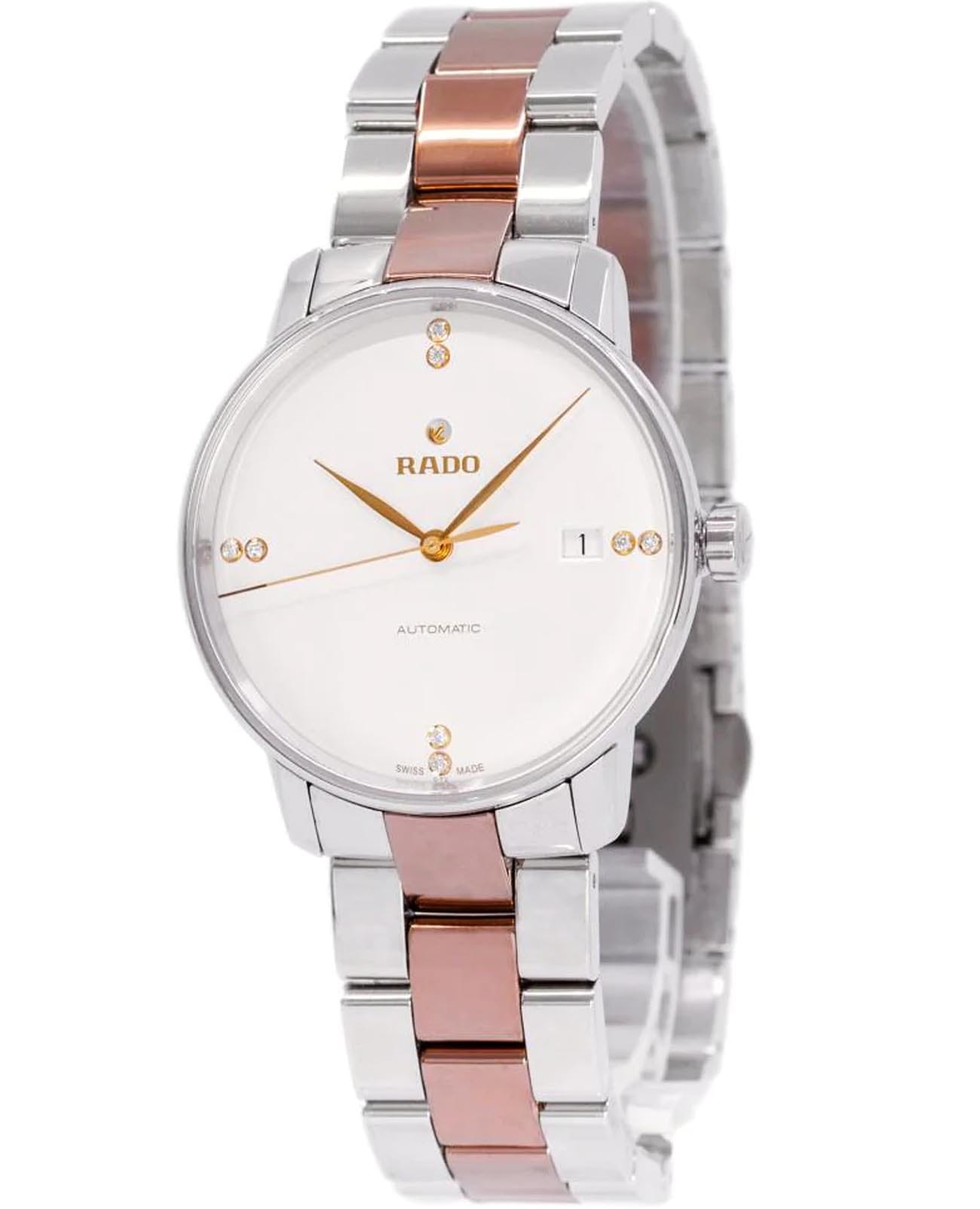 Мужские швейцарские механические часы с автоподзаводом Rado Coupole R22860722. Корпус часов изготовлен из нержавеющей стали. Сапфировое стеклоСапфировое стеклоПрочный и надёжный материал из кристалла сапфира синтетического происхождения, характеризующийся особой твёрдостью и устойчивостью к царапинам и повреждениям. устойчивое к мелким механическим повреждениям. Стальной браслет с частичным PVD-покрытиемPVDУльтратонкое покрытие наносится в технике вакуумного напыления, сочетает в себе нитрид титана особой прочности со слоем золота или оксида хрома. Несёт в себе декоративную или защитную функцию. на раскладной застёжкеРаскладная застёжкаТакой тип застёжки используется только на браслетах из металла. Она никогда не раскрывается полностью, происходит разделение на 2 и более частей. Раскладывающая застёжка снизит вероятность потери часов к минимуму.. Класс водозащиты: 50 метров, позволит защитить корпус от случайных брызг или капель дождя. Окошко даты находится в положении 3 часа. Циферблат инкрустирован бриллиантами.