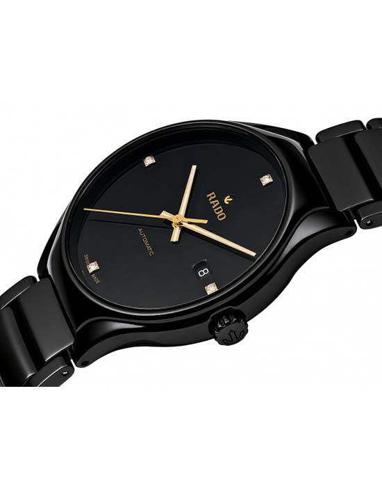 Глянцевый корпус представлен в оригинальном дизайне, его линии плавно перетекают в браслет. Наручные часы выполнены из высокотехнологичной керамикиВысокотехнологичная керамикаИнновационный запатентованный Rado материал с гладкой или матовой поверхностью. Керамика за счёт кристаллической структуры обладает повышенной устойчивостью от возникновения царапин. Материал способен принимать температуру тела человека, обеспечивая невероятный комфорт при ношении., материал не вызывает аллергии и обеспечивает невероятный комфорт при ношении. Минималистичный циферблат инкрустирован 4 бриллиантами в 0,040 карат. Швейцарский кварцевый калибр ETA 955.112. Сапфировое стекло устойчиво к образованию царапин. Золотистые стрелки с люминесцентной подсветкойЛюминесцентное покрытиеПозволяет считывать показания времени в темноте. Производители наносят на стрелки, часовые индексы, безель или поверхность циферблата светонакопительный состав, дающий холодное свечение.. Водостойкость 5 бар. . Отображение даты. Диаметр корпуса: 40 мм.