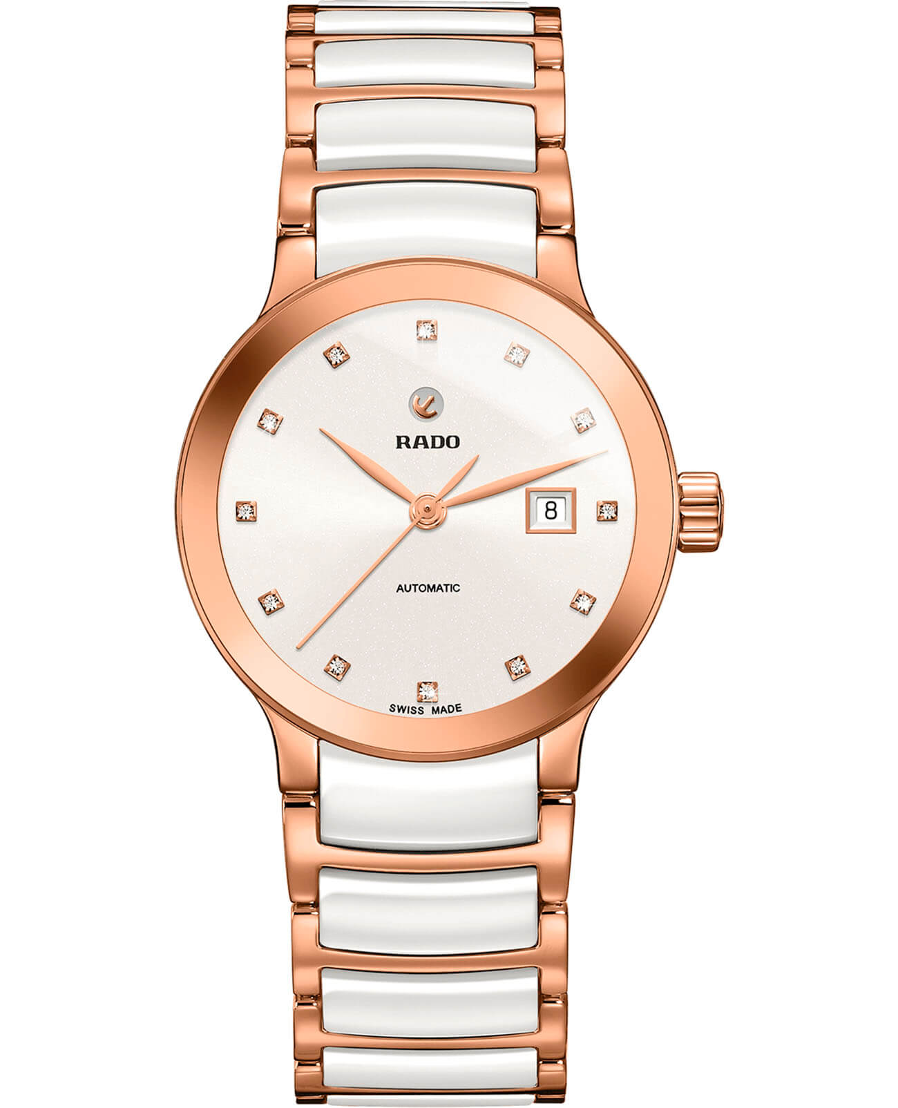 Изысканная модель в минималистичном исполнении грамотно завершит образ. Благодаря роскошному циферблату премиальный аксессуар сразу притягивает внимание, перед блеском 12 бриллиантов в 0,025 карат. Автоподзавод. Швейцарский калибр ETA 2671 имеет запас хода до 38 часов. Скелетонизированная задняя крышка стального корпуса. Сапфировое стекло. Браслет из нержавеющей стали 316L с PVD-покрытиемPVDУльтратонкое покрытие наносится в технике вакуумного напыления, сочетает в себе нитрид титана особой прочности со слоем золота или оксида хрома. Несёт в себе декоративную или защитную функцию. и вставок из высокотехнологичной керамикиВысокотехнологичная керамикаИнновационный запатентованный Rado материал с гладкой или матовой поверхностью. Керамика за счёт кристаллической структуры обладает повышенной устойчивостью от возникновения царапин. Материал способен принимать температуру тела человека, обеспечивая невероятный комфорт при ношении.. Водонепроницаемость 30 метров. Надёжная . Отображение числа. Диаметр корпуса: 28 мм.