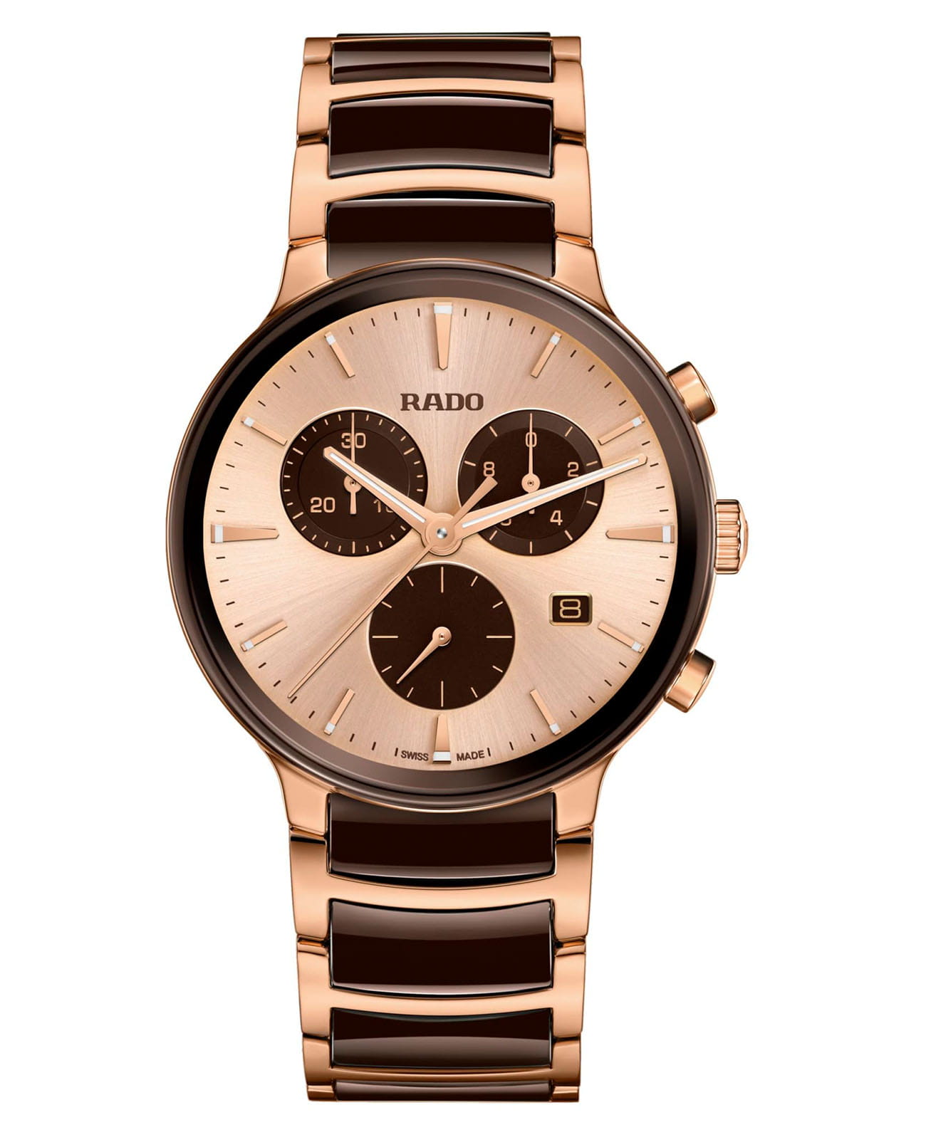 Мужские кварцевые часы Rado Centrix Chronograph — это гармоничное сочетание художественного дизайна и технического совершенства. Корпус диаметром 41 мм и толщиной 11,4 мм выполнен из нержавеющей стали с PVD-покрытиемPVDУльтратонкое покрытие наносится в технике вакуумного напыления, сочетает в себе нитрид титана особой прочности со слоем золота или оксида хрома. Несёт в себе декоративную или защитную функцию. розового золота. Циферблат цвета шампань с эффектом «солнечные лучи» оформлен розовыми индексами с люминесцентным покрытиемЛюминесцентное покрытиеПозволяет считывать показания времени в темноте. Производители наносят на стрелки, часовые индексы, безель или поверхность циферблата светонакопительный состав, дающий холодное свечение. Super-Luminova®, обеспечивающим отличную читаемость в темноте. Циферблат защищён выпуклым сапфировым стекломСапфировое стеклоПрочный и надёжный материал из кристалла сапфира синтетического происхождения, характеризующийся особой твёрдостью и устойчивостью к царапинам и повреждениям. с антибликовым покрытиемАнтибликовое покрытиеСлой оксида металла в 0,13-0,3 микрон, благодаря которому стекло часов не бликует и не отражает свет. Антибликовое покрытие уменьшает отражение света в 10 раз, обеспечивая отличную читаемость показателей циферблата. с обеих сторон. Механизм — швейцарский кварцевый с функцией хронографаХронографФункция позволяет измерять отрезки времени с особой точностью: часы, минуты, секунды. Верным признаком хронографа является наличие на циферблате 3 дополнительных окошек-счётчиков., оснащённый 22 камнями и технологиями Precidrive и Heavydrive, обеспечивающими точность хода ±10 секунд в год. Циферблат включает три субциферблата: 30-минутный счётчик, индикатор одной десятой секунды и малые секунды в положении 6 часов. Окошко даты расположено в положении 4 часов. Часы оснащены браслетом из полированной нержавеющей стали с вставками из высокотехнологичной керамикиВысокотехнологичная керамикаИнновационный запатентованный Rado материал с гладкой или матовой поверхностью. Керамика за счёт кристаллической структуры обладает повышенной устойчивостью от возникновения царапин. Материал способен принимать температуру тела человека, обеспечивая невероятный комфорт при ношении. коричневого цвета и застёжка «бабочка» с кнопкамиЗастёжка "бабочка"Такой вид застёжки дополняется предохранителями, помогающими избежать случайного раскрытия браслета. Обладают изящным исполнением. из матовой стали. Водонепроницаемость 50 м позволяет использовать часы в повседневных условиях. Гарантия — 5 лет. Идеальный выбор для тех, кто ценит точность, стиль и швейцарское качество.