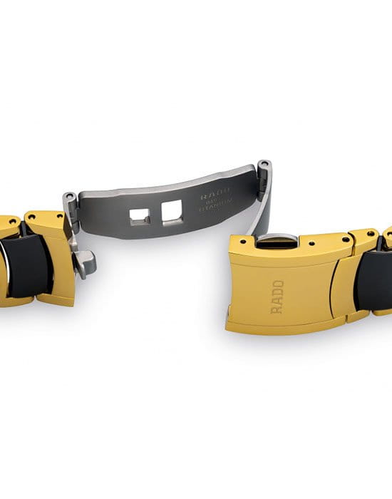 Традиционный круглый циферблат чёрного цвета с золотистыми стрелками и метками имеет узор «солнечные лучи», лаконичное исполнение делает аксессуар универсальным вариантом для любого события. Корпус и браслет выполнены из хирургической стали 316L, браслет сделан в сочетании с высокотехнологичной керамикойВысокотехнологичная керамикаИнновационный запатентованный Rado материал с гладкой или матовой поверхностью. Керамика за счёт кристаллической структуры обладает повышенной устойчивостью от возникновения царапин. Материал способен принимать температуру тела человека, обеспечивая невероятный комфорт при ношении.. В основе работы находится кварцевый механизм ETA 955.112 с высокой точностью хода. Сапфировое стекло устойчиво к образованию царапин на поверхности. Сохранение водонепроницаемости при давлении до 3 бар. PVD-покрытиеPVDУльтратонкое покрытие наносится в технике вакуумного напыления, сочетает в себе нитрид титана особой прочности со слоем золота или оксида хрома. Несёт в себе декоративную или защитную функцию. цвета «жёлтое золото». Отображение даты. Диаметр корпуса: 38 мм.