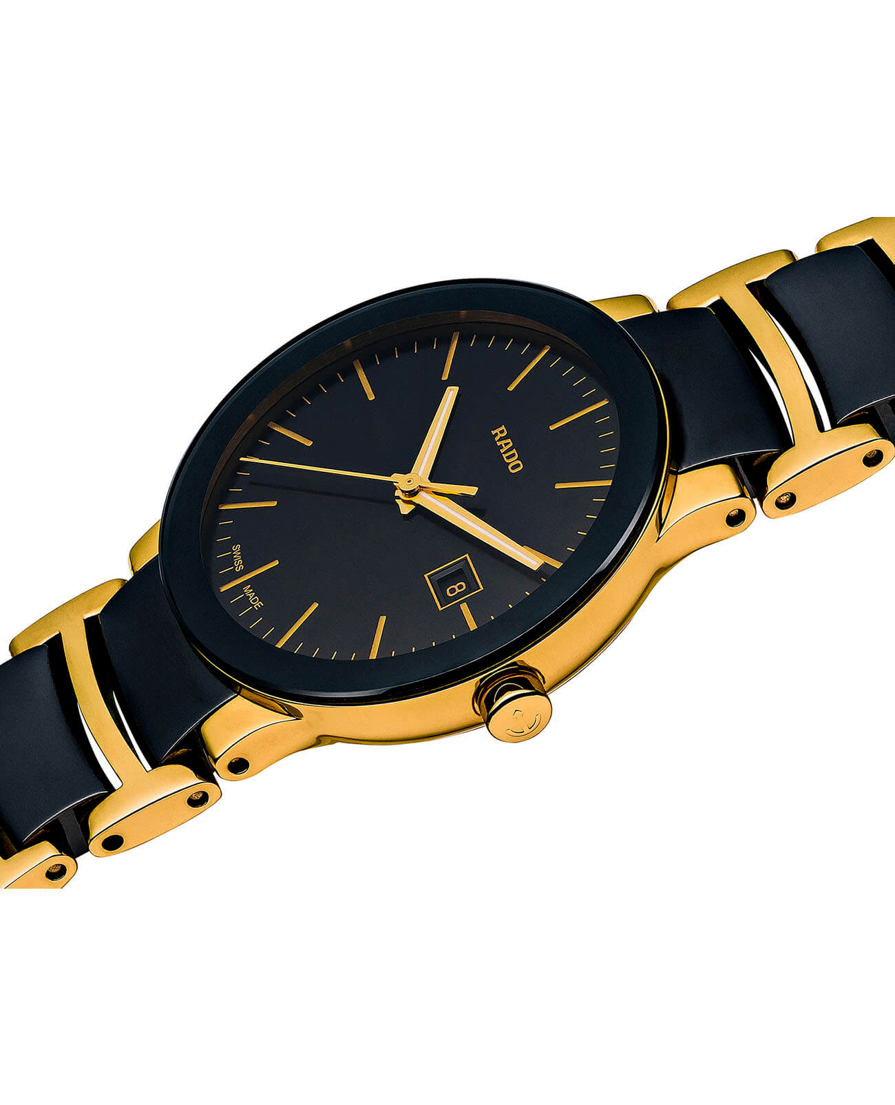 Утончённая модель в минималистичном стиле никогда не выйдет из моды, гармонично сочетаясь с любым нарядом. Элегантный чёрный циферблат дополнен золотистыми часовыми индексами и удлинёнными стрелками, обеспечивающими идеальную читаемость показателей времени. Часы оснащены высокоточным кварцевым механизмом ETA 956.112. Использование нержавеющей стали 316L с PVD-покрытиемPVDУльтратонкое покрытие наносится в технике вакуумного напыления, сочетает в себе нитрид титана особой прочности со слоем золота или оксида хрома. Несёт в себе декоративную или защитную функцию., высокотехнологичной керамикиВысокотехнологичная керамикаИнновационный запатентованный Rado материал с гладкой или матовой поверхностью. Керамика за счёт кристаллической структуры обладает повышенной устойчивостью от возникновения царапин. Материал способен принимать температуру тела человека, обеспечивая невероятный комфорт при ношении.. Надёжное стекло из сапфира. Водостойкость до 3 бар. Отображение текущего числа. Диаметр корпуса: 28 мм.