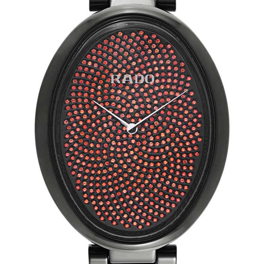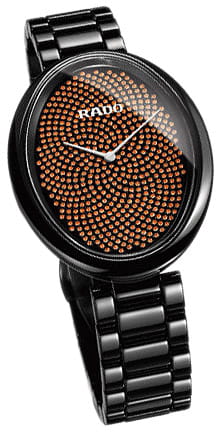 Женские керамические швейцарские часы с бриллиантами Rado Esenza R53094752, кварцевый механизм с высокой точностью. Сапфировое стеклоСапфировое стеклоПрочный и надёжный материал из кристалла сапфира синтетического происхождения, характеризующийся особой твёрдостью и устойчивостью к царапинам и повреждениям. устойчивое к появлению царапин, обладающее высокой прозрачностью. Класс водозащиты: 30 метров, позволит защитить корпус от случайных брызг или капель дождя. Корпус и браслет часов изготовлены из высокотехнологичной керамикиВысокотехнологичная керамикаИнновационный запатентованный Rado материал с гладкой или матовой поверхностью. Керамика за счёт кристаллической структуры обладает повышенной устойчивостью от возникновения царапин. Материал способен принимать температуру тела человека, обеспечивая невероятный комфорт при ношении.. Браслет на раскладной застёжкеРаскладная застёжкаТакой тип застёжки используется только на браслетах из металла. Она никогда не раскрывается полностью, происходит разделение на 2 и более частей. Раскладывающая застёжка снизит вероятность потери часов к минимуму.. Циферблат декорирован 534 оранжевыми сапфирами .801 карат.