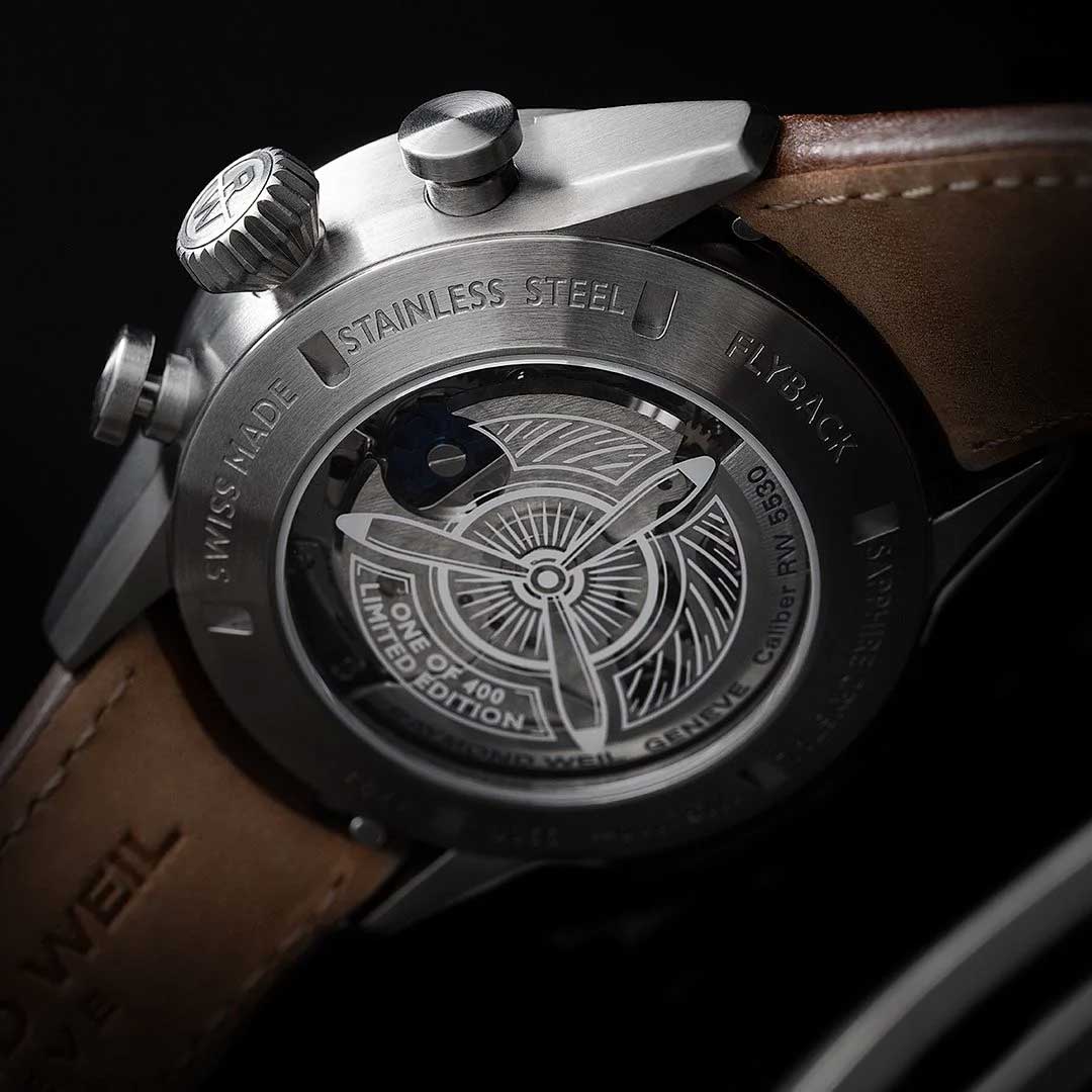 Запас хода составляет 56 часов, а циферблат с арабскими цифрами защищен прочным сапфировым стекломСапфировое стеклоПрочный и надёжный материал из кристалла сапфира синтетического происхождения, характеризующийся особой твёрдостью и устойчивостью к царапинам и повреждениям.. Завинчивающаяся задняя крышка украшена выгравированным изображением пропеллера, что подчеркивает авиационную тематику. Завинчивающаяся заводная головка с логотипом RW и ремешок из натуральной кожи с раскладной застёжкойРаскладная застёжкаТакой тип застёжки используется только на браслетах из металла. Она никогда не раскрывается полностью, происходит разделение на 2 и более частей. Раскладывающая застёжка снизит вероятность потери часов к минимуму., завершают этот стильный аксессуар.