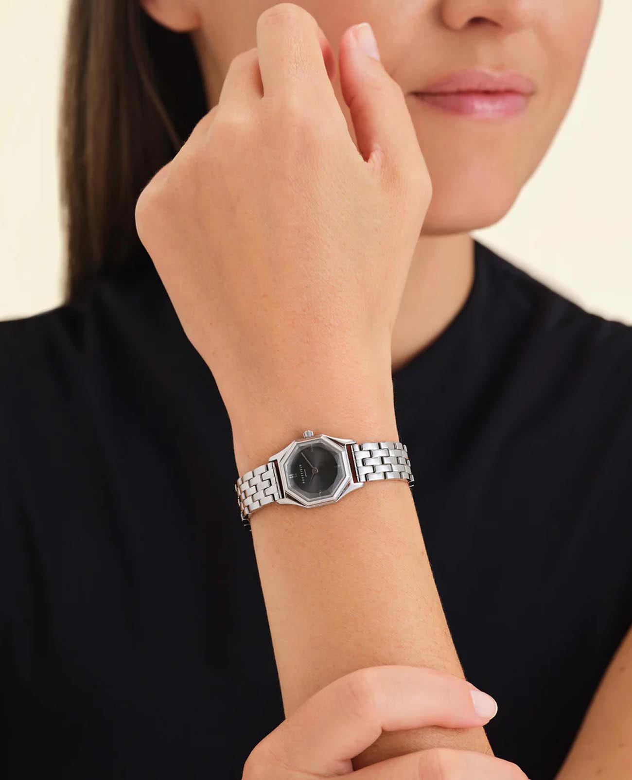 Женские кварцевые часы Rosefield The Gemme GGSSS-G05. Центральные часовая, минутная и секундная стрелки. Восьмиугольный корпус выполнен из полированной нержавеющей стали. Размер корпуса составляет 21,5 х 27,5 мм. Стальной браслет c ювелирной застежкой. Прочное минеральное стеклоМинеральное стеклоМинеральное стекло представляет собой искусственно выращенный минерал кварца. Такое стекло отличается особой устойчивостью к повреждениям и царапинам. Уступает по некоторым качествам сапфировому стеклу. устойчивое к мелким механическим повреждениям. Класс водозащиты: 30 метров, позволит защитить корпус от случайных брызг или капель дождя.