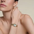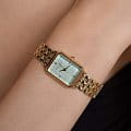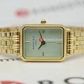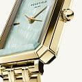 Женские кварцевые часы. Центральные часовая, минутная и секундная стрелки. Бирюзовый циферблат. Восьмиугольный корпус выполнен из полированной нержавеющей стали с IP-покрытиемIP-покрытиеМетод ионного напыления. Демонстрирует повышенную устойчивость к истиранию, окислению и химическим веществам. Под воздействием высокого давления и температуры около 1500°C молекулы металла надёжно соединяются с частицами корпуса часов. цвета желтого золота. Размер корпуса составляет 21,5 х 27,5 мм. Стальной браслет c IP-покрытиемIP-покрытиеМетод ионного напыления. Демонстрирует повышенную устойчивость к истиранию, окислению и химическим веществам. Под воздействием высокого давления и температуры около 1500°C молекулы металла надёжно соединяются с частицами корпуса часов. с ювелирной застежкой. Прочное минеральное стеклоМинеральное стеклоМинеральное стекло представляет собой искусственно выращенный минерал кварца. Такое стекло отличается особой устойчивостью к повреждениям и царапинам. Уступает по некоторым качествам сапфировому стеклу. устойчивое к мелким механическим повреждениям. Водостойкость WR 30 (брызги). В комплекте аксессуар - женский браслет.