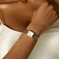 Женские кварцевые часы. Центральные часовая, минутная и секундная стрелки. Серебристый циферблат. Восьмиугольный корпус выполнен из металла с IP покрытием цвета желтого золота. Размер корпуса составляет 19,5 х 24 мм, толщина 7 мм. Стальной браслет с частичным покрытием, браслетная застежка. Прочное минеральное стекло устойчивое к мелким механическим повреждениям. Водостойкость WR 30 (брызги).