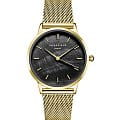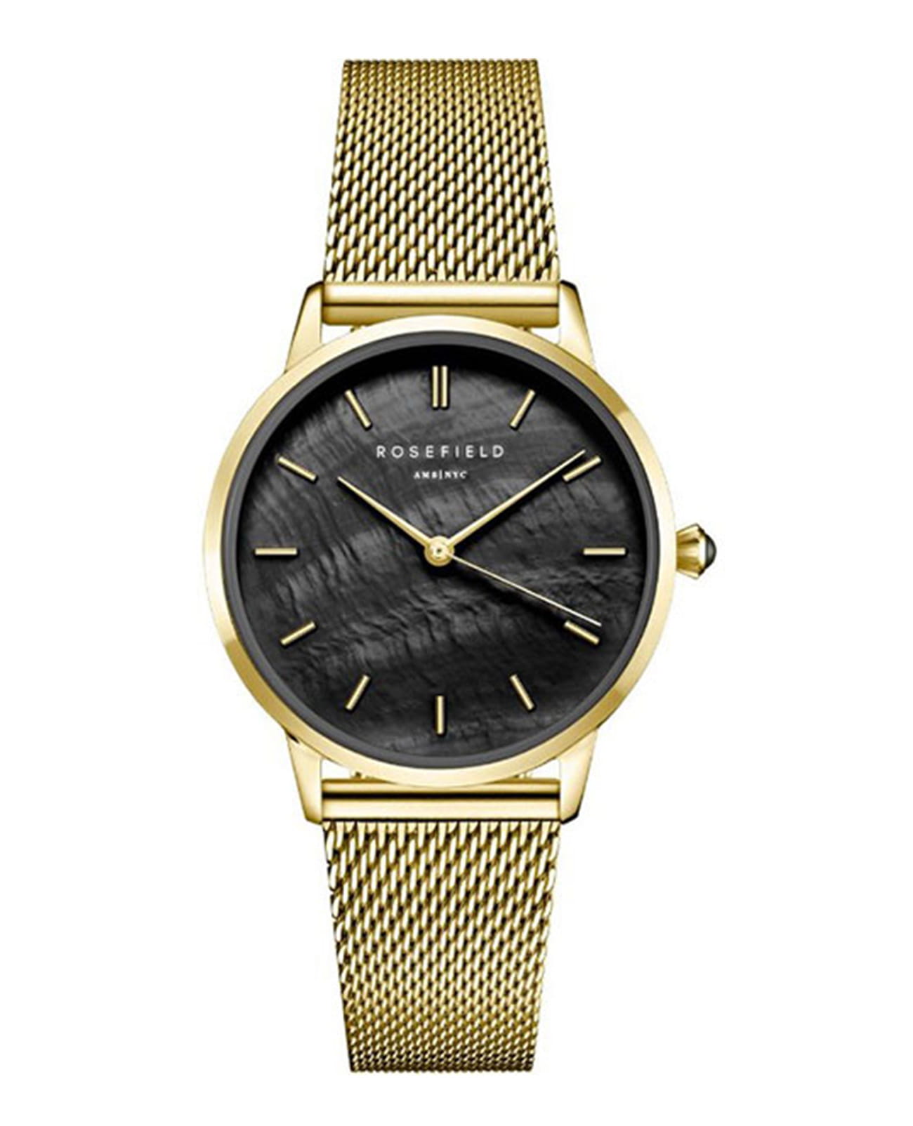 Женские кварцевые часы Rosefield RBGMG-R07. Черный перламутровый циферблат. Круглый корпус выполнен из металла с IP покрытием цвета желтого золота. Диаметр корпуса составляет 36 мм, толщина 7,5 мм. Стальной браслет с покрытием выполнен в технике миланского плетения, раскладная застежка. Прочное минеральное стекло устойчивое к мелким механическим повреждениям. Водостойкость WR 30 (брызги).