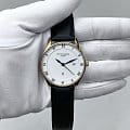 Стальной корпус круглой формы диаметром 38.2 мм и толщиной 9.2 мм выполнен из нержавеющей стали с частичным золотистым покрытием, что придает часам элегантный и премиальный вид. Циферблат белого цвета с римскими цифрами и метками в виде штрихов надежно защищен закаленным минеральным стекломМинеральное стеклоМинеральное стекло представляет собой искусственно выращенный минерал кварца. Такое стекло отличается особой устойчивостью к повреждениям и царапинам. Уступает по некоторым качествам сапфировому стеклу., что предотвращает появление царапин и повреждений.