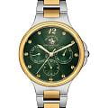 Женские кварцевые часы Santa Barbara Polo & Racquet Club — это элегантный аксессуар, подчеркивающий романтичное настроение. Корпус диаметром 35 мм и высотой 42 мм выполнен из латуни. Безель с IP-покрытиемIP-покрытиеМетод ионного напыления. Демонстрирует повышенную устойчивость к истиранию, окислению и химическим веществам. Под воздействием высокого давления и температуры около 1500°C молекулы металла надёжно соединяются с частицами корпуса часов.. Циферблат зелёного цвета с гильошированной текстурой украшен фирменным логотипом и накладными метками в виде точек, а также арабской цифрой 12. Указатели дня недели и даты вынесены на отдельные субциферблаты, также присутствует индикация 24-часового формата времени. Циферблат защищён минеральным стекломМинеральное стеклоМинеральное стекло представляет собой искусственно выращенный минерал кварца. Такое стекло отличается особой устойчивостью к повреждениям и царапинам. Уступает по некоторым качествам сапфировому стеклу.. Механизм — кварцевый калибр VX3JE1. Часы оснащены браслетом из нержавеющей стали с частичным IP-покрытиемIP-покрытиеМетод ионного напыления. Демонстрирует повышенную устойчивость к истиранию, окислению и химическим веществам. Под воздействием высокого давления и температуры около 1500°C молекулы металла надёжно соединяются с частицами корпуса часов. на раскладной застёжкеРаскладная застёжкаТакой тип застёжки используется только на браслетах из металла. Она никогда не раскрывается полностью, происходит разделение на 2 и более частей. Раскладывающая застёжка снизит вероятность потери часов к минимуму.. Водонепроницаемость 50 м позволяет использовать часы в повседневных условиях. Идеальный выбор для тех, кто ценит женственность, стиль и качество.
