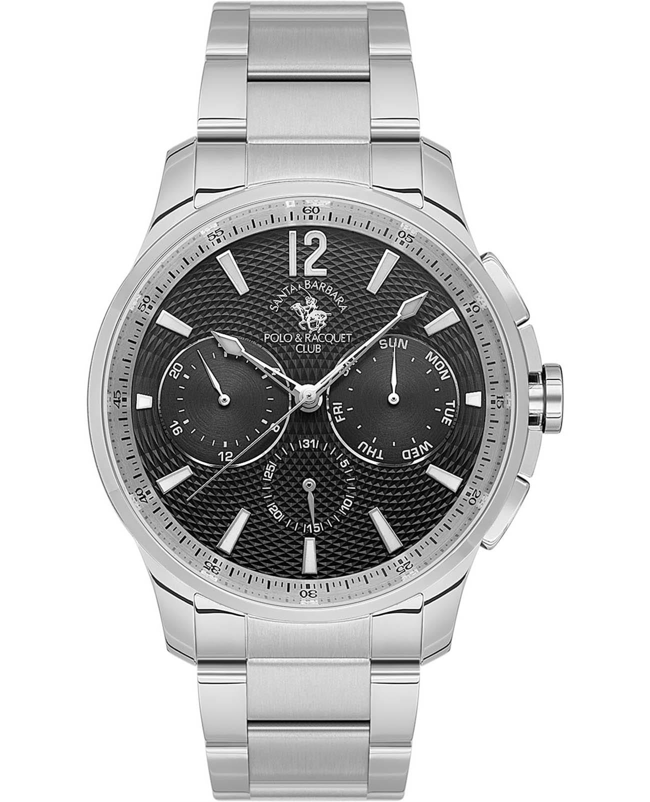 Мужские кварцевые часы Santa Barbara Polo & Racquet Club — это идеальный выбор для тех, кто ценит практичность и стиль. Корпус диаметром 43 мм выполнен из нержавеющей стали 316L с матовой и полированной отделкой. Циферблат чёрного цвета с текстурной поверхностью украшен фирменным логотипом и накладными метками в виде штрихов. Указатели дня недели и даты вынесены на отдельные субциферблаты, также присутствует индикация 24-часового формата времени. Стрелки и метки с люминесцентным покрытиемЛюминесцентное покрытиеПозволяет считывать показания времени в темноте. Производители наносят на стрелки, часовые индексы, безель или поверхность циферблата светонакопительный состав, дающий холодное свечение., обеспечивающим хорошую читаемость в темноте. Циферблат защищён минеральным стекломМинеральное стеклоМинеральное стекло представляет собой искусственно выращенный минерал кварца. Такое стекло отличается особой устойчивостью к повреждениям и царапинам. Уступает по некоторым качествам сапфировому стеклу.. Часы оснащены стальным браслетом с застёжкой «бабочка» с кнопкамиЗастёжка "бабочка"Такой вид застёжки дополняется предохранителями, помогающими избежать случайного раскрытия браслета. Обладают изящным исполнением. . Водонепроницаемость 50 м позволяет использовать часы в повседневных условиях. Идеальный выбор для тех, кто ценит классический дизайн, точность и надёжность.
