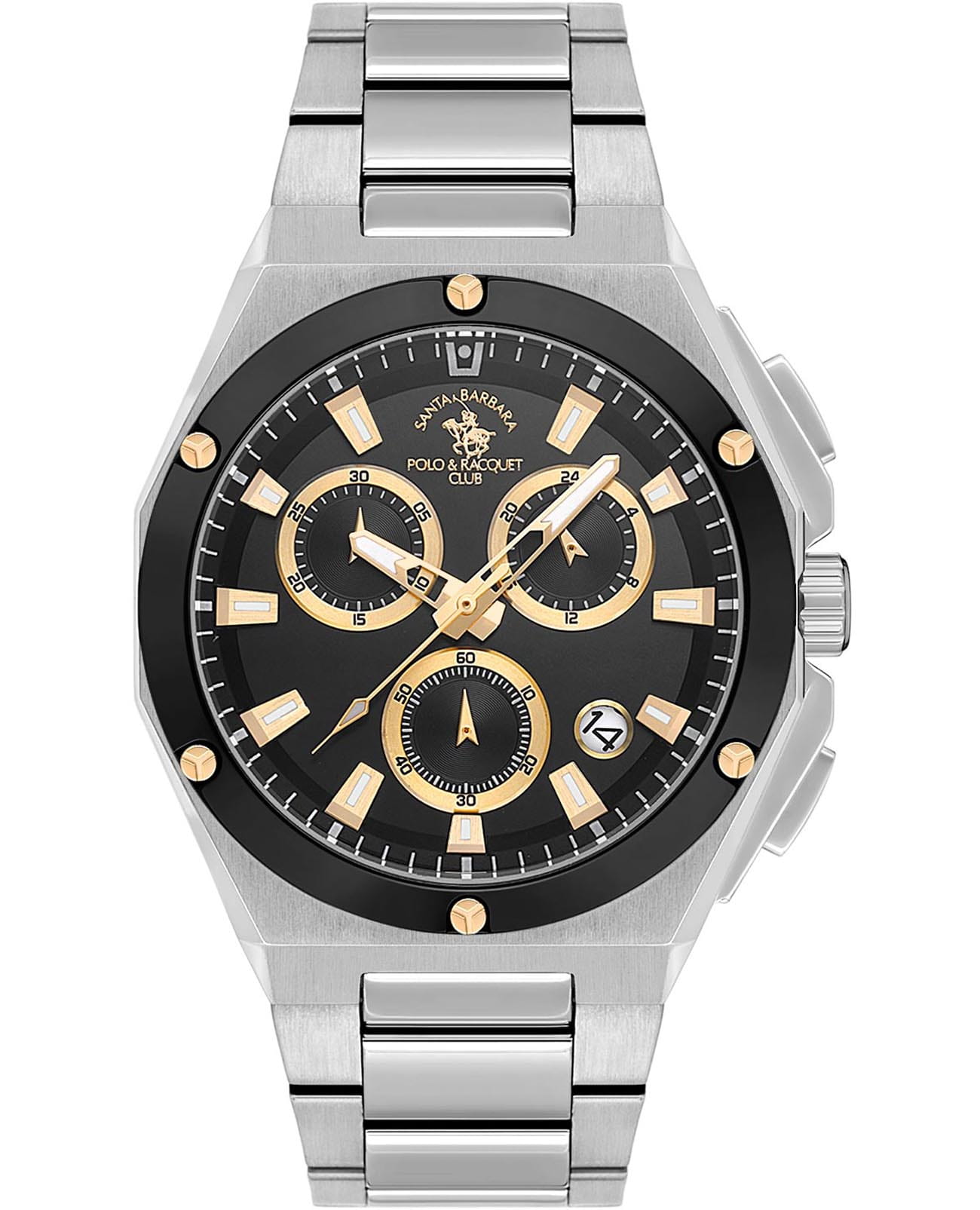 Santa Barbara Polo & Racquet Club Prive SB.1.10577-4 — стильные мужские часы-хронограф, сочетающие спортивную динамику и функциональность. Крупный корпус выполнен из нержавеющей стали 316L с неподвижным безелемБезельВнешний ободок, закрепляющий стекло. В спортивных часах так называется поворотное кольцо с делениями на циферблате, выполняет роль таймера – замеряет отрезки времени на шкале. Неподвижный безель – элемент декора. Однонаправленно вращающийся безель на дайверских часах позволяет фиксировать моменты погружения и выныривания на поверхность. с IP-покрытиемIP-покрытиеМетод ионного напыления. Демонстрирует повышенную устойчивость к истиранию, окислению и химическим веществам. Под воздействием высокого давления и температуры около 1500°C молекулы металла надёжно соединяются с частицами корпуса часов. и гармонично дополнен браслетом на раскладной застёжкеРаскладная застёжкаТакой тип застёжки используется только на браслетах из металла. Она никогда не раскрывается полностью, происходит разделение на 2 и более частей. Раскладывающая застёжка снизит вероятность потери часов к минимуму.. Циферблат с акцентными метками и стрелками с люминесцентным покрытиемЛюминесцентное покрытиеПозволяет считывать показания времени в темноте. Производители наносят на стрелки, часовые индексы, безель или поверхность циферблата светонакопительный состав, дающий холодное свечение. оформлен в многослойной структуре и оснащён вспомогательными индикаторами, включая хронографХронографФункция позволяет измерять отрезки времени с особой точностью: часы, минуты, секунды. Верным признаком хронографа является наличие на циферблате 3 дополнительных окошек-счётчиков., 24-часовой формат времени. В нижней части расположено окошко даты, что делает модель ещё более практичной. Минеральное стеклоМинеральное стеклоМинеральное стекло представляет собой искусственно выращенный минерал кварца. Такое стекло отличается особой устойчивостью к повреждениям и царапинам. Уступает по некоторым качествам сапфировому стеклу. защищает циферблат от царапин, а кварцевый механизм обеспечивает высокую точность. Водонепроницаемость 50 метров позволит защитить корпус от случайных брызг или капель дождя. Благодаря своей универсальной эстетике эти часы уместны и в деловой среде, и в повседневном образе.