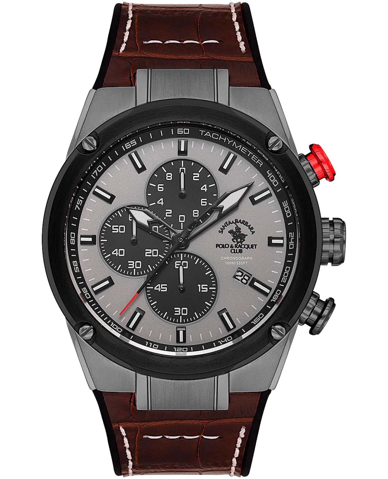 Мужские кварцевые часы-хронографХронографФункция позволяет измерять отрезки времени с особой точностью: часы, минуты, секунды. Верным признаком хронографа является наличие на циферблате 3 дополнительных окошек-счётчиков. с секундомеромСекундомерСекундоме́р — прибор, способный измерять интервалы времени с точностью до долей секунды. Santa Barbara Polo & Racquet Club SB.3.10001-4 — воплощение элегантности и технического совершенства. Корпус из нержавеющей стали с IP-покрытиемIP-покрытиеМетод ионного напыления. Демонстрирует повышенную устойчивость к истиранию, окислению и химическим веществам. Под воздействием высокого давления и температуры около 1500°C молекулы металла надёжно соединяются с частицами корпуса часов. серого цвета, диаметром 45 мм, что делает их устойчивыми к внешним воздействиям и придает благородный вид. Стрелки и метки с люминесцентным покрытиемЛюминесцентное покрытиеПозволяет считывать показания времени в темноте. Производители наносят на стрелки, часовые индексы, безель или поверхность циферблата светонакопительный состав, дающий холодное свечение., обеспечивающим хорошую читаемость в темноте. Неподвижный безельБезельВнешний ободок, закрепляющий стекло. В спортивных часах так называется поворотное кольцо с делениями на циферблате, выполняет роль таймера – замеряет отрезки времени на шкале. Неподвижный безель – элемент декора. Однонаправленно вращающийся безель на дайверских часах позволяет фиксировать моменты погружения и выныривания на поверхность. с IP-покрытиемIP-покрытиеМетод ионного напыления. Демонстрирует повышенную устойчивость к истиранию, окислению и химическим веществам. Под воздействием высокого давления и температуры около 1500°C молекулы металла надёжно соединяются с частицами корпуса часов. черного цвета. Циферблат защищён минеральным стекломМинеральное стеклоМинеральное стекло представляет собой искусственно выращенный минерал кварца. Такое стекло отличается особой устойчивостью к повреждениям и царапинам. Уступает по некоторым качествам сапфировому стеклу. устойчивое к царапинам и механическим повреждениям. Окошко даты находится в положении 4 часа, тахиметрТахиметрРазмеченная шкала, располагается на ободке или безеле часов. Тахиметр позволяет рассчитать скорость на определённом участке пути, расстояние измеряется в километрах или милях. по внешнему краю. Кожаный ремешок на стандартной застёжке обеспечивает комфортное и безопасное ношение. Водонепроницаемость 100 метров позволит плавать, нырять и заниматься другими водными видами спорта. Идеальный выбор для тех, кто ценит элегантный дизайн и качество.