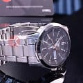 Современные японские наручные мужские часы. Круглый корпус и браслет часов выполнены из высокопрочной стали с антикоррозийными свойствами. Темный фон циферблата и стальные элементы дизайна. Водонепроницаемость 5 ATM. Минеральное стекло Hardlex, устойчивое к появлению царапин.