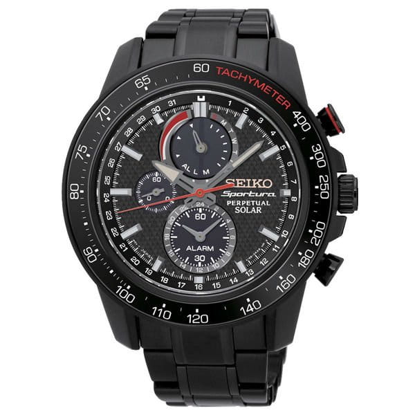 Эффектные мужские часы в современным дизайном. Механизм работает от солнечной энергии, калибр Seiko V198. Корпус круглой формы, с черным аналоговый циферблатом, и браслет выполнены из нержавеющей стали с PVD покрытием. Сапфировое  стекло устойчиво к царапинам. Оснащены функциями хронографа, вечного календаря и будильника. Водонепроницаемость 100 м.