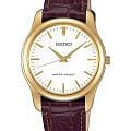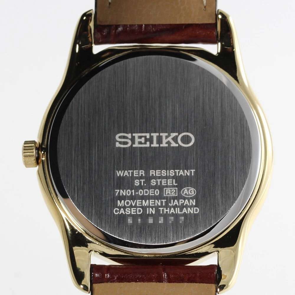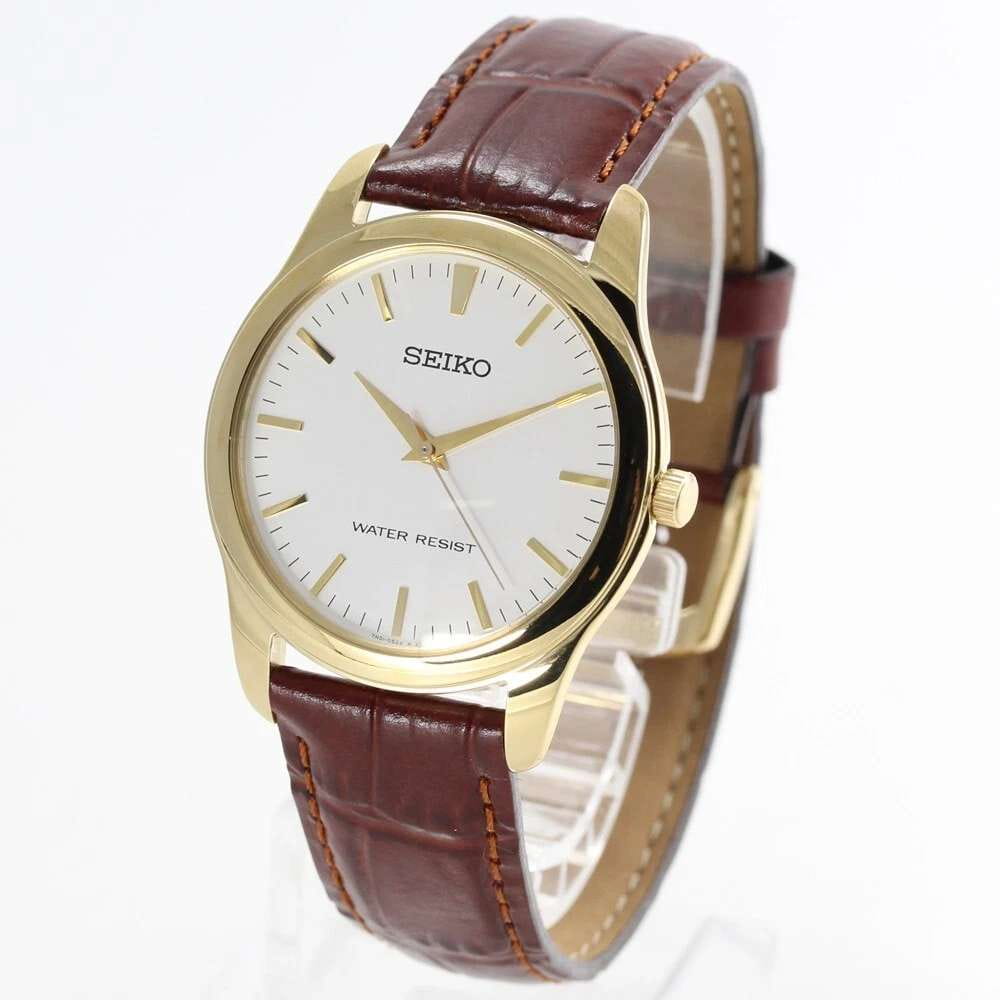 Женские кварцевые часы Seiko — это надёжный и универсальный аксессуар. Корпус диаметром 35 мм выполнен из нержавеющей стали с IP-покрытиемIP-покрытиеМетод ионного напыления. Демонстрирует повышенную устойчивость к истиранию, окислению и химическим веществам. Под воздействием высокого давления и температуры около 1500°C молекулы металла надёжно соединяются с частицами корпуса часов. цвета жёлтого золота. Циферблат белого цвета оформлен индексами и стрелками, включая центральную секундную стрелку. Циферблат защищён прочным закалённым минеральным стеклом Hardlex минеральным стекломМинеральное стеклоМинеральное стекло представляет собой искусственно выращенный минерал кварца. Такое стекло отличается особой устойчивостью к повреждениям и царапинам. Уступает по некоторым качествам сапфировому стеклу.. Механизм — японское кварцевое движение калибра 7N01 с высокой точностью хода (±10–15 сек. в месяц). Часы оснащены коричневым кожаным ремешком на классической пряжке. Водонепроницаемость 30 м позволяет использовать часы в повседневных условиях. Идеальный выбор для тех, кто ценит японское качество и классический дизайн.