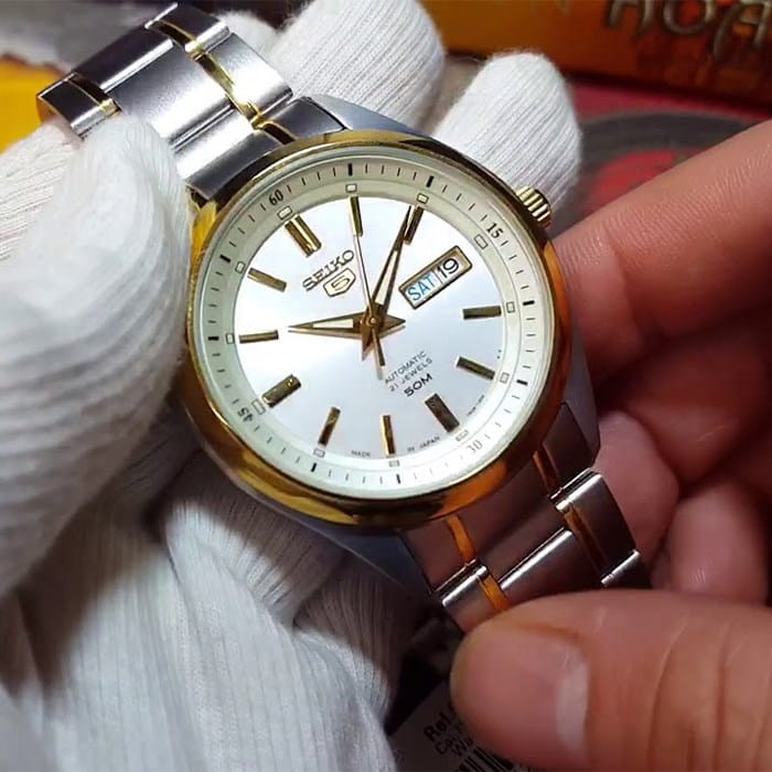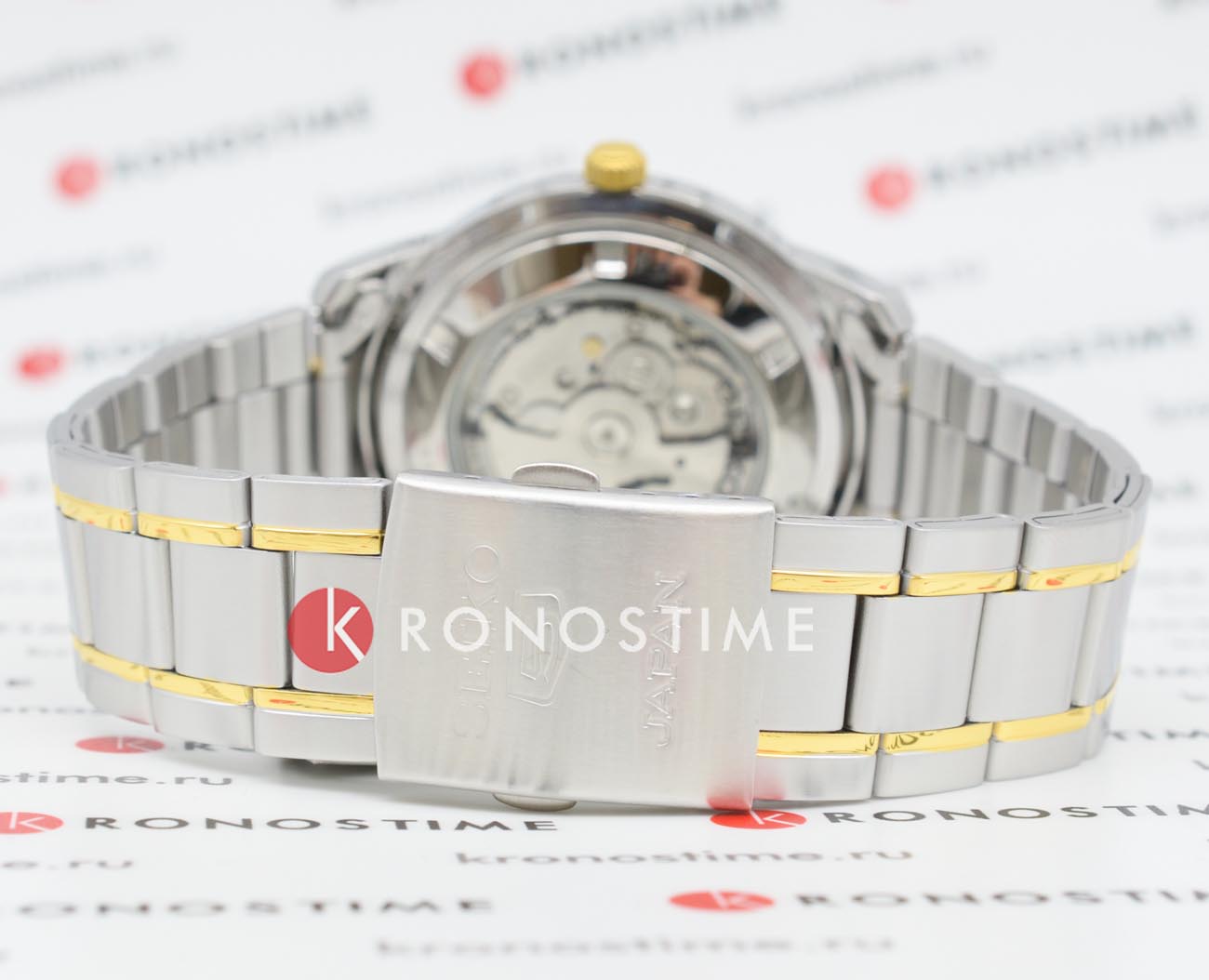 Элегантный аксессуар в биколорном исполнении стильно смотрится на широком мужском запястье, выгодно подчёркивая ваш тонкий вкус. БезельБезельВнешний ободок, закрепляющий стекло. В спортивных часах так называется поворотное кольцо с делениями на циферблате, выполняет роль таймера – замеряет отрезки времени на шкале. Неподвижный безель – элемент декора. Однонаправленно вращающийся безель на дайверских часах позволяет фиксировать моменты погружения и выныривания на поверхность. с PVD-покрытиемPVDУльтратонкое покрытие наносится в технике вакуумного напыления, сочетает в себе нитрид титана особой прочности со слоем золота или оксида хрома. Несёт в себе декоративную или защитную функцию.. Светлый циферблат с золотистыми стрелками и метками обеспечивает идеальную читаемость данных, он защищён минеральным стекломМинеральное стеклоМинеральное стекло представляет собой искусственно выращенный минерал кварца. Такое стекло отличается особой устойчивостью к повреждениям и царапинам. Уступает по некоторым качествам сапфировому стеклу. Hardlex с закаленной поверхностью. Абсолютная точность хода достигается благодаря автоматическому японскому механизму 7S26, запас хода которого рассчитан на 40 часов. Прозрачная задняя крышка позволяет наблюдать за движением деталей калибра. Часы устойчивы к воздействию магнитного поля, прочные корпус и браслет сделаны из стали 316L с частичным PVD-покрытиемPVDУльтратонкое покрытие наносится в технике вакуумного напыления, сочетает в себе нитрид титана особой прочности со слоем золота или оксида хрома. Несёт в себе декоративную или защитную функцию.. Стрелки имеют люминесцентную подсветкуЛюминесцентное покрытиеПозволяет считывать показания времени в темноте. Производители наносят на стрелки, часовые индексы, безель или поверхность циферблата светонакопительный состав, дающий холодное свечение.. На метке 3 часов размещена апертура даты, отображается текущее число и день недели. Диаметр корпуса: 43 мм.