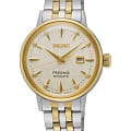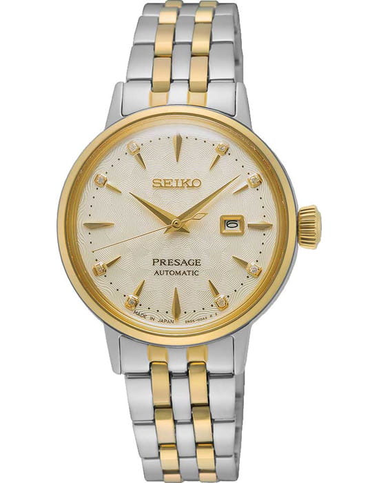 Женские механические часы Seiko Presage SRE010J1 с автоподзаводом. Водозащита: 50 метров, позволит защитить корпус от случайных брызг или капель дождя. Корпус часов изготовлен из нержавеющей стали. Стрелки и метки с люминесцентным покрытиемЛюминесцентное покрытиеПозволяет считывать показания времени в темноте. Производители наносят на стрелки, часовые индексы, безель или поверхность циферблата светонакопительный состав, дающий холодное свечение.. Стальной браслет с PVD-покрытиемPVDУльтратонкое покрытие наносится в технике вакуумного напыления, сочетает в себе нитрид титана особой прочности со слоем золота или оксида хрома. Несёт в себе декоративную или защитную функцию. на застёжке-бабочке с кнопкамиЗастёжка "бабочка"Такой вид застёжки дополняется предохранителями, помогающими избежать случайного раскрытия браслета. Обладают изящным исполнением. . Окошко даты находится в положении трёх часов.