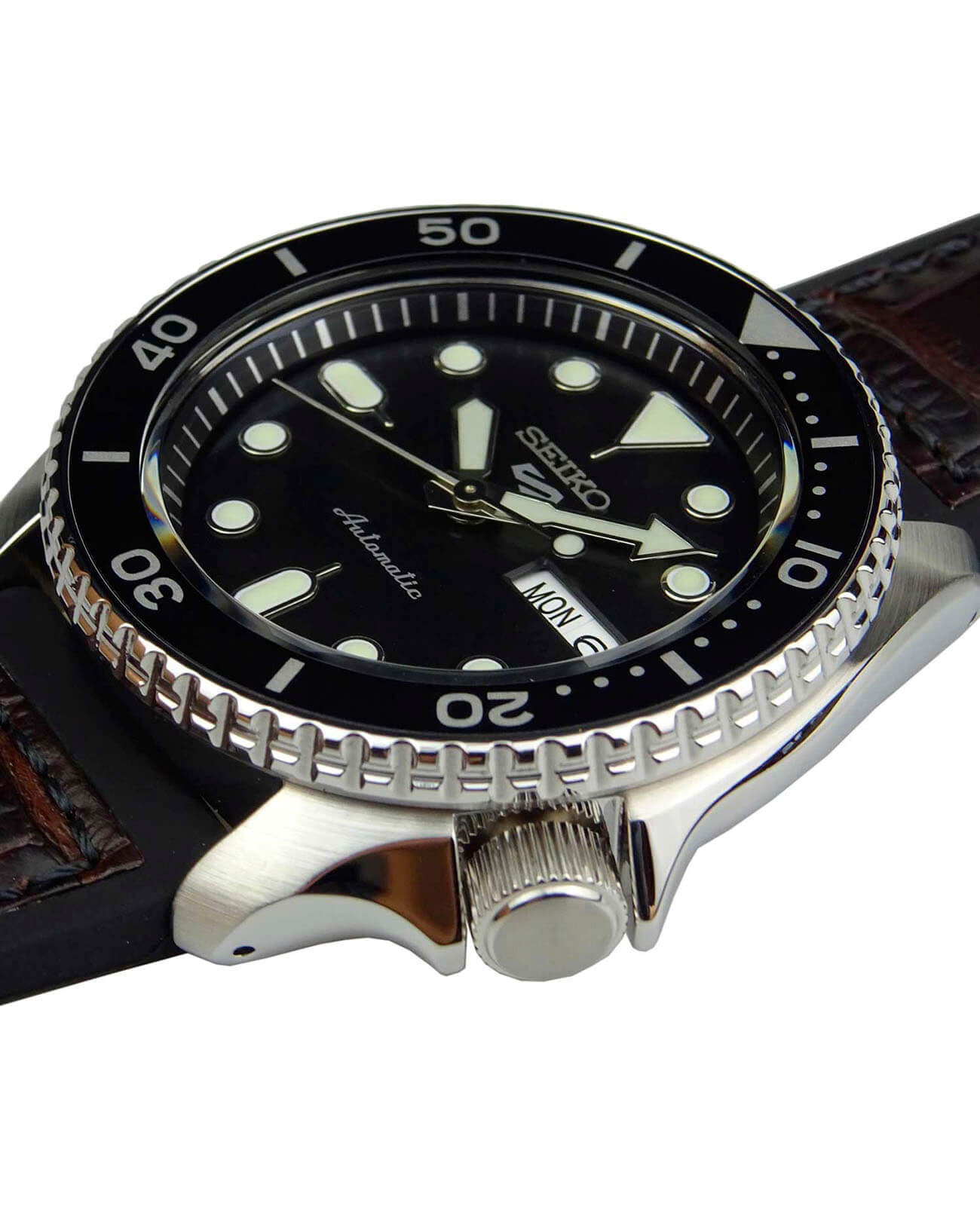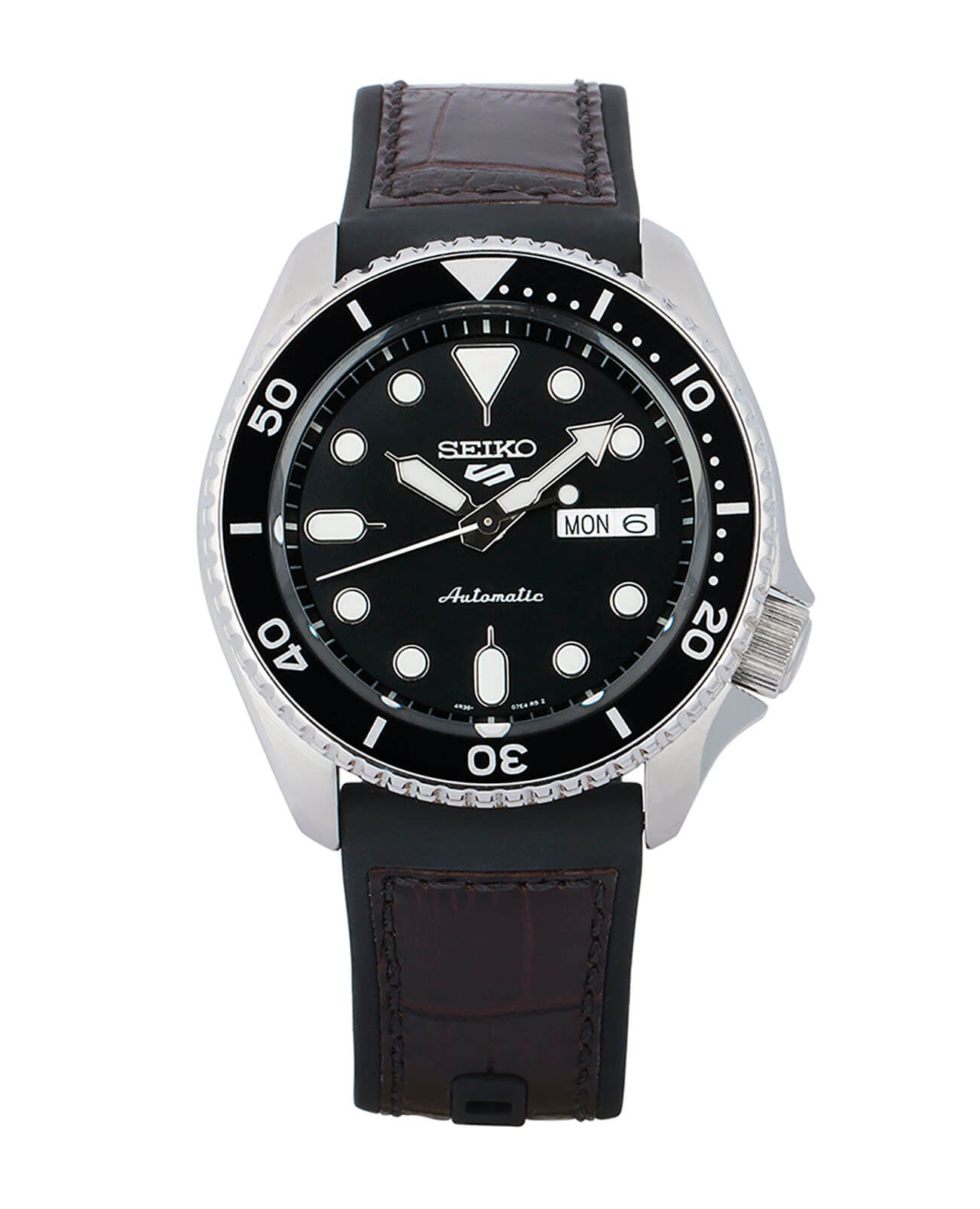 Часы Seiko 5 Sports SRPD55K2 сочетают в себе элегантный дизайн и надёжность, характерные для японского часового мастерства. Корпус диаметром 42,5 мм выполнен из нержавеющей стали, а чёрный циферблат защищён минеральным стекломМинеральное стеклоМинеральное стекло представляет собой искусственно выращенный минерал кварца. Такое стекло отличается особой устойчивостью к повреждениям и царапинам. Уступает по некоторым качествам сапфировому стеклу. с повышенной прочностью. БезельБезельВнешний ободок, закрепляющий стекло. В спортивных часах так называется поворотное кольцо с делениями на циферблате, выполняет роль таймера – замеряет отрезки времени на шкале. Неподвижный безель – элемент декора. Однонаправленно вращающийся безель на дайверских часах позволяет фиксировать моменты погружения и выныривания на поверхность. с PVD-покрытиемPVDУльтратонкое покрытие наносится в технике вакуумного напыления, сочетает в себе нитрид титана особой прочности со слоем золота или оксида хрома. Несёт в себе декоративную или защитную функцию..