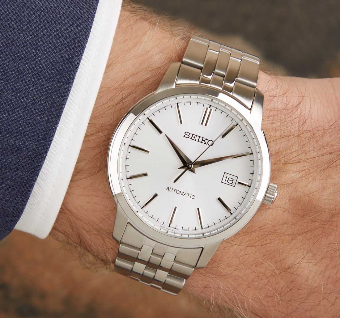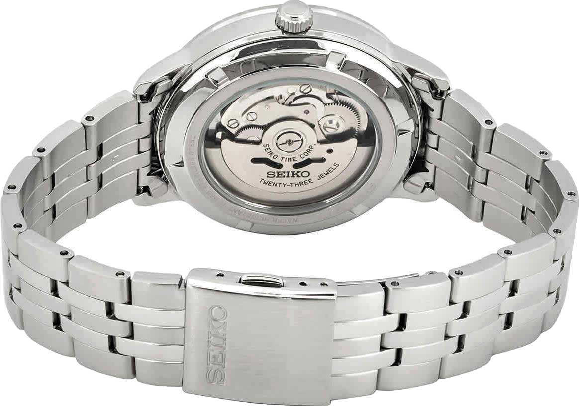 Seiko SRPH85K1 — сдержанная и надёжная модель, сочетающая классический дизайн с ежедневной практичностью. Корпус из нержавеющей стали диаметром 41,2 мм аккуратно полирован и отделан с обтекаемыми гранями, создавая элегантный и универсальный образ . Циферблат серебристого тона украшен минималистичными часовыми метками и тонкими стрелками из стали. Окошко даты на отметке «3 часа» придаёт функциональности, сохраняя при этом визуальную чистоту. Покрытие циферблата — прочное минеральное стеклоМинеральное стеклоМинеральное стекло представляет собой искусственно выращенный минерал кварца. Такое стекло отличается особой устойчивостью к повреждениям и царапинам. Уступает по некоторым качествам сапфировому стеклу., устойчивое к царапинам и нежелательным воздействиям . Модель оснащена автоматическим калибром 4R35 с ручным подзаводом, 23 камнями, функцией остановки секундной стрелки и запасом хода до примерно 41 часа . Прозрачная задняя крышка позволяет наблюдать за механизмом — тонкой и гармоничной работой его компонентов . Браслет из нержавеющей стали завершён удобной раскладной застёжкойРаскладная застёжкаТакой тип застёжки используется только на браслетах из металла. Она никогда не раскрывается полностью, происходит разделение на 2 и более частей. Раскладывающая застёжка снизит вероятность потери часов к минимуму. с кнопочной фиксацией, обеспечивающей надёжное ношение и лёгкость при надевании . Водозащита до 100 м (10 бар) позволяет спокойно эксплуатировать часы при рукотворных бытовых или водных нагрузках . Элегантная SRPH85K1 — образец сдержанной эстетики, инженерной аккуратности и ежедневной надёжности. Ведь в ней сочетаются минимализм, японская точность и продуманная функциональность.