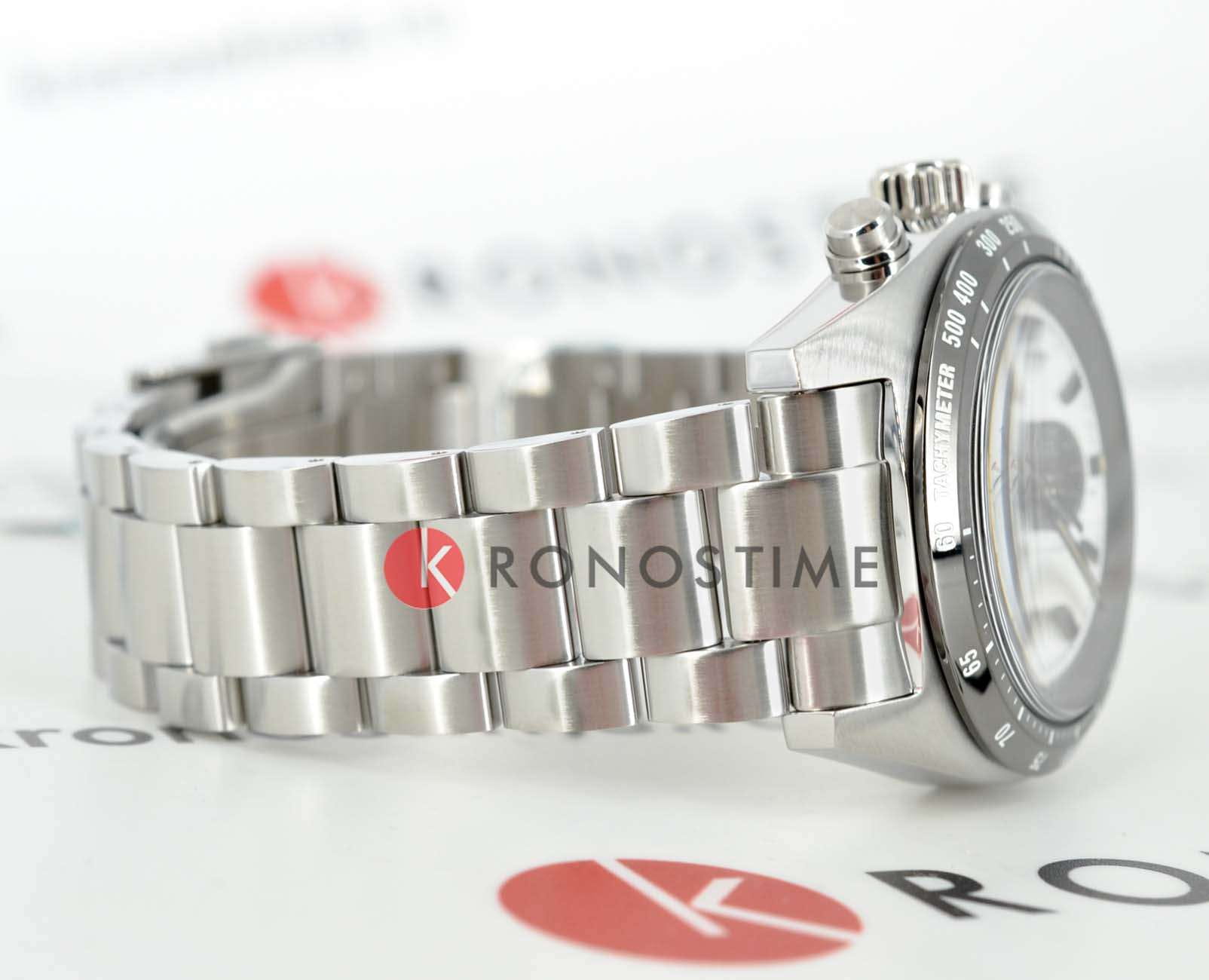 Модель Seiko SSC813 из коллекции Prospex Speedtimer — это солнечный хронограф в популярном "панда-дизайне", сочетающий винтажную эстетику и современные технологии. Корпус диаметром 39 мм выполнен из нержавеющей стали, обеспечивая компактность и удобную посадку на запястье. Чёрный фиксированный тахиметрический безельТахиметрРазмеченная шкала, располагается на ободке или безеле часов. Тахиметр позволяет рассчитать скорость на определённом участке пути, расстояние измеряется в километрах или милях. позволяет проводить измерения скорости по времени. Белый циферблат с пескоструйной текстурой дополнен чёрными счётчиками хронографа. Стрелки и метки покрыты люминесцентным покрытиемЛюминесцентное покрытиеПозволяет считывать показания времени в темноте. Производители наносят на стрелки, часовые индексы, безель или поверхность циферблата светонакопительный состав, дающий холодное свечение., обеспечивая высокую читаемость даже в тёмное время суток. Часы оснащены солнечным кварцевым механизмом Seiko V192, который заряжается от любого источника света и обеспечивает до 6 месяцев автономной работы. В функционал входят хронографХронографФункция позволяет измерять отрезки времени с особой точностью: часы, минуты, секунды. Верным признаком хронографа является наличие на циферблате 3 дополнительных окошек-счётчиков. на 60 минут, индикация 24 часов, даты и индикатор запаса хода. Циферблат защищён выпуклым сапфировым стекломСапфировое стеклоПрочный и надёжный материал из кристалла сапфира синтетического происхождения, характеризующийся особой твёрдостью и устойчивостью к царапинам и повреждениям. с антибликовым покрытиемАнтибликовое покрытиеСлой оксида металла в 0,13-0,3 микрон, благодаря которому стекло часов не бликует и не отражает свет. Антибликовое покрытие уменьшает отражение света в 10 раз, обеспечивая отличную читаемость показателей циферблата., что гарантирует отличную видимость и устойчивость к царапинам. Браслет выполнен из нержавеющей стали и дополнен надёжной раскладной застёжкойРаскладная застёжкаТакой тип застёжки используется только на браслетах из металла. Она никогда не раскрывается полностью, происходит разделение на 2 и более частей. Раскладывающая застёжка снизит вероятность потери часов к минимуму. с кнопками. Seiko SSC813 — это универсальные спортивные часы с выразительным ретро-дизайном, точным солнечным механизмом и высоким уровнем исполнения, подходящие как для повседневной носки, так и для активного образа жизни.