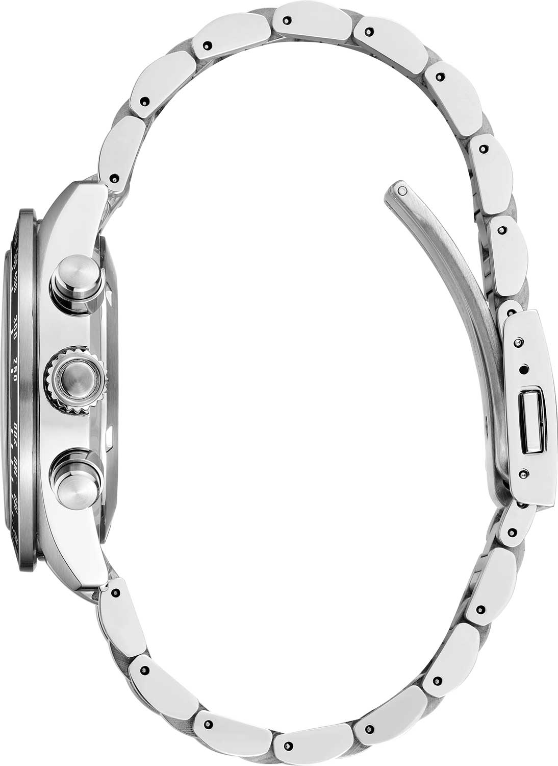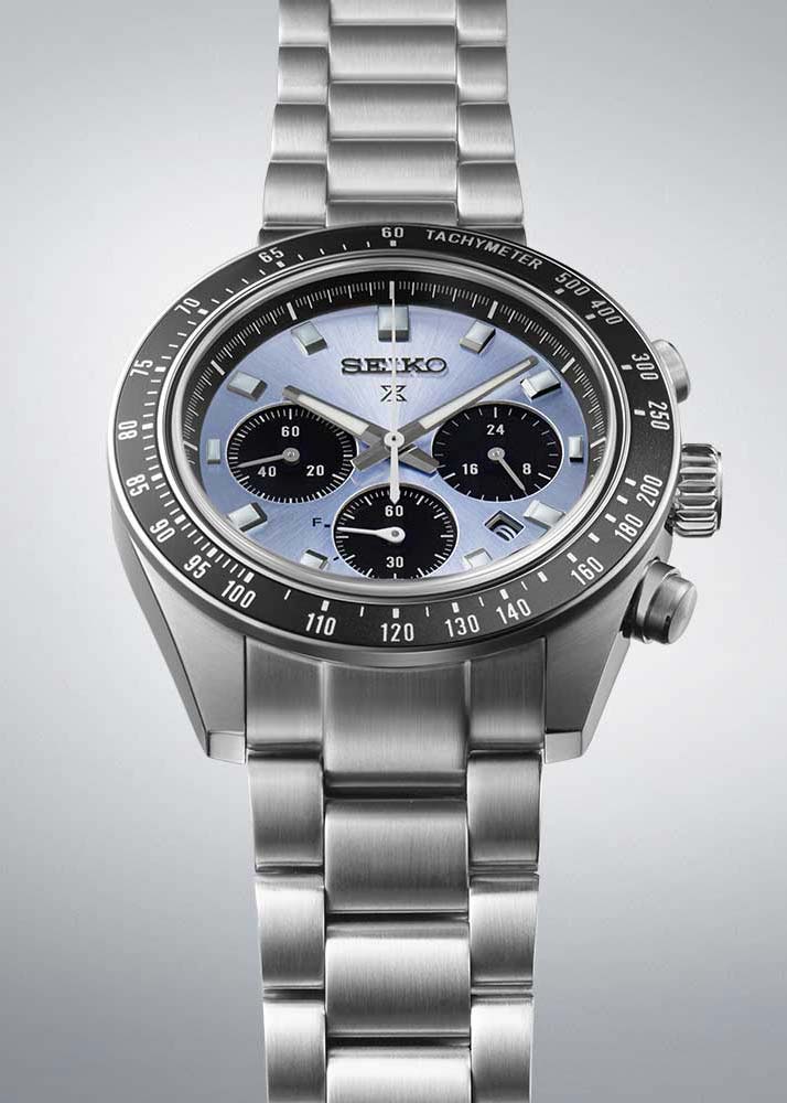 Модель Seiko SSC935P1 из коллекции Prospex Speedtimer — это спортивный солнечный хронограф с выразительным дизайном и высокой функциональностью. Корпус диаметром 41,4 мм выполнен из нержавеющей стали и оснащён завинчивающейся задней крышкой и заводной головкой, обеспечивая водозащиту до 100 метров. Фиксированный алюминиевый тахиметрический безельТахиметрРазмеченная шкала, располагается на ободке или безеле часов. Тахиметр позволяет рассчитать скорость на определённом участке пути, расстояние измеряется в километрах или милях. позволяет производить измерения скорости. Циферблат насыщенного голубого оттенка с солнечным финишем дополнен тремя чёрными счётчиками: 24-часовым, малой секундной стрелкой и хронографом на 60 минут. Стрелки и индексы покрыты люминесцентным покрытиемЛюминесцентное покрытиеПозволяет считывать показания времени в темноте. Производители наносят на стрелки, часовые индексы, безель или поверхность циферблата светонакопительный состав, дающий холодное свечение. LumiBrite для превосходной видимости в тёмное время суток. Защиту циферблата обеспечивает выпуклое сапфировое стеклоСапфировое стеклоПрочный и надёжный материал из кристалла сапфира синтетического происхождения, характеризующийся особой твёрдостью и устойчивостью к царапинам и повреждениям. с внутренним антибликовым покрытиемАнтибликовое покрытиеСлой оксида металла в 0,13-0,3 микрон, благодаря которому стекло часов не бликует и не отражает свет. Антибликовое покрытие уменьшает отражение света в 10 раз, обеспечивая отличную читаемость показателей циферблата., устойчивое к царапинам и бликам. Внутри установлен солнечный кварцевый калибр V192 с функциями хронографаХронографФункция позволяет измерять отрезки времени с особой точностью: часы, минуты, секунды. Верным признаком хронографа является наличие на циферблате 3 дополнительных окошек-счётчиков., индикацией 24 часов, даты и запаса хода. Полного заряда хватает до 6 месяцев автономной работы. Браслет из нержавеющей стали надёжно фиксируется при помощи раскладной застёжкиРаскладная застёжкаТакой тип застёжки используется только на браслетах из металла. Она никогда не раскрывается полностью, происходит разделение на 2 и более частей. Раскладывающая застёжка снизит вероятность потери часов к минимуму. с кнопками.