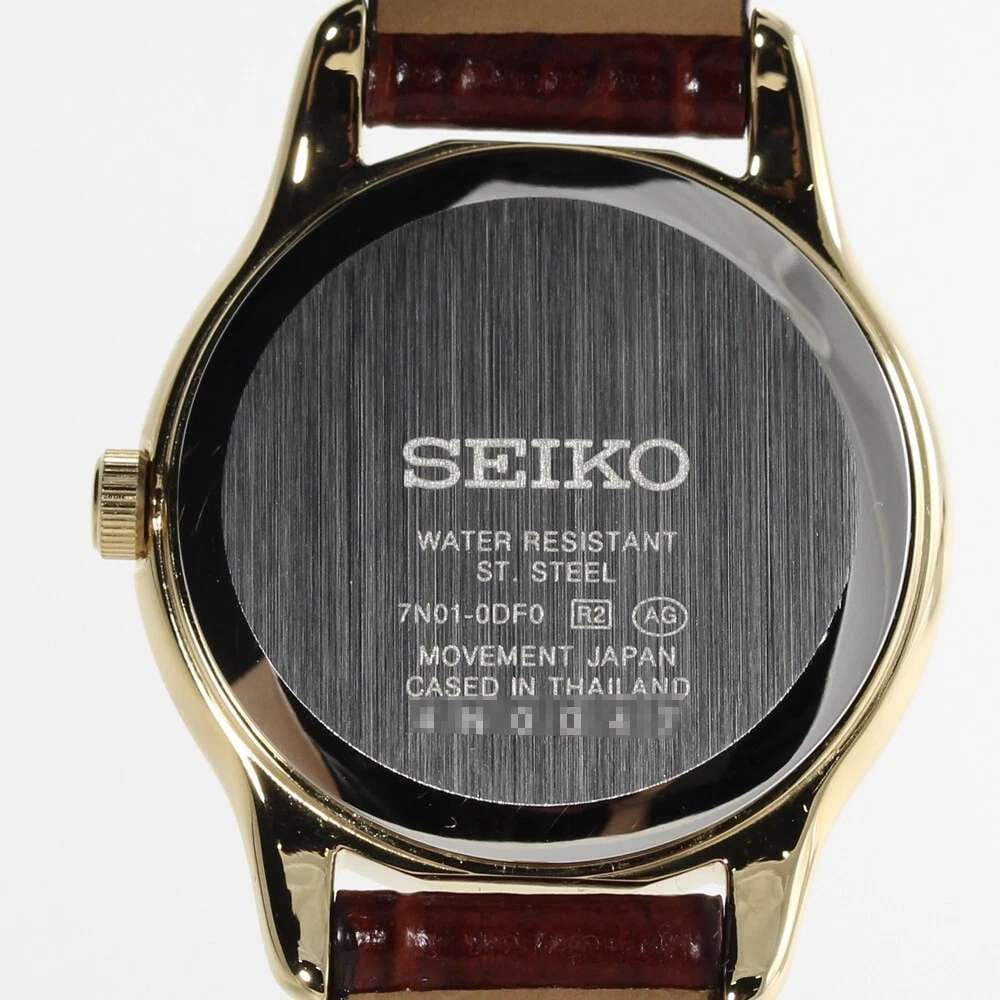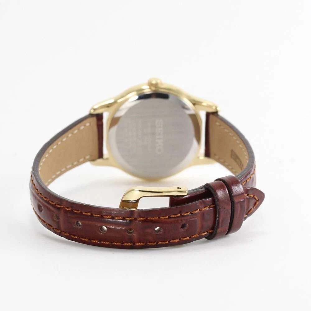 Женские кварцевые часы Seiko — это надёжный и универсальный аксессуар. Корпус размером 25,8 мм и толщиной 6 мм выполнен из нержавеющей стали с IP-покрытиемIP-покрытиеМетод ионного напыления. Демонстрирует повышенную устойчивость к истиранию, окислению и химическим веществам. Под воздействием высокого давления и температуры около 1500°C молекулы металла надёжно соединяются с частицами корпуса часов. цвета золота. Циферблат белого цвета оформлен индексами и стрелками, включая центральную секундную стрелку. Циферблат защищён прочным закалённым минеральным стеклом Hardlex минеральным стекломМинеральное стеклоМинеральное стекло представляет собой искусственно выращенный минерал кварца. Такое стекло отличается особой устойчивостью к повреждениям и царапинам. Уступает по некоторым качествам сапфировому стеклу.. Механизм — кварцевый с высокой точностью хода (±15 сек. в месяц). Часы оснащены коричневым кожаным ремешком на классической пряжке. Водонепроницаемость позволяет использовать часы в повседневных условиях. Идеальный выбор для тех, кто ценит японское качество и классический дизайн.