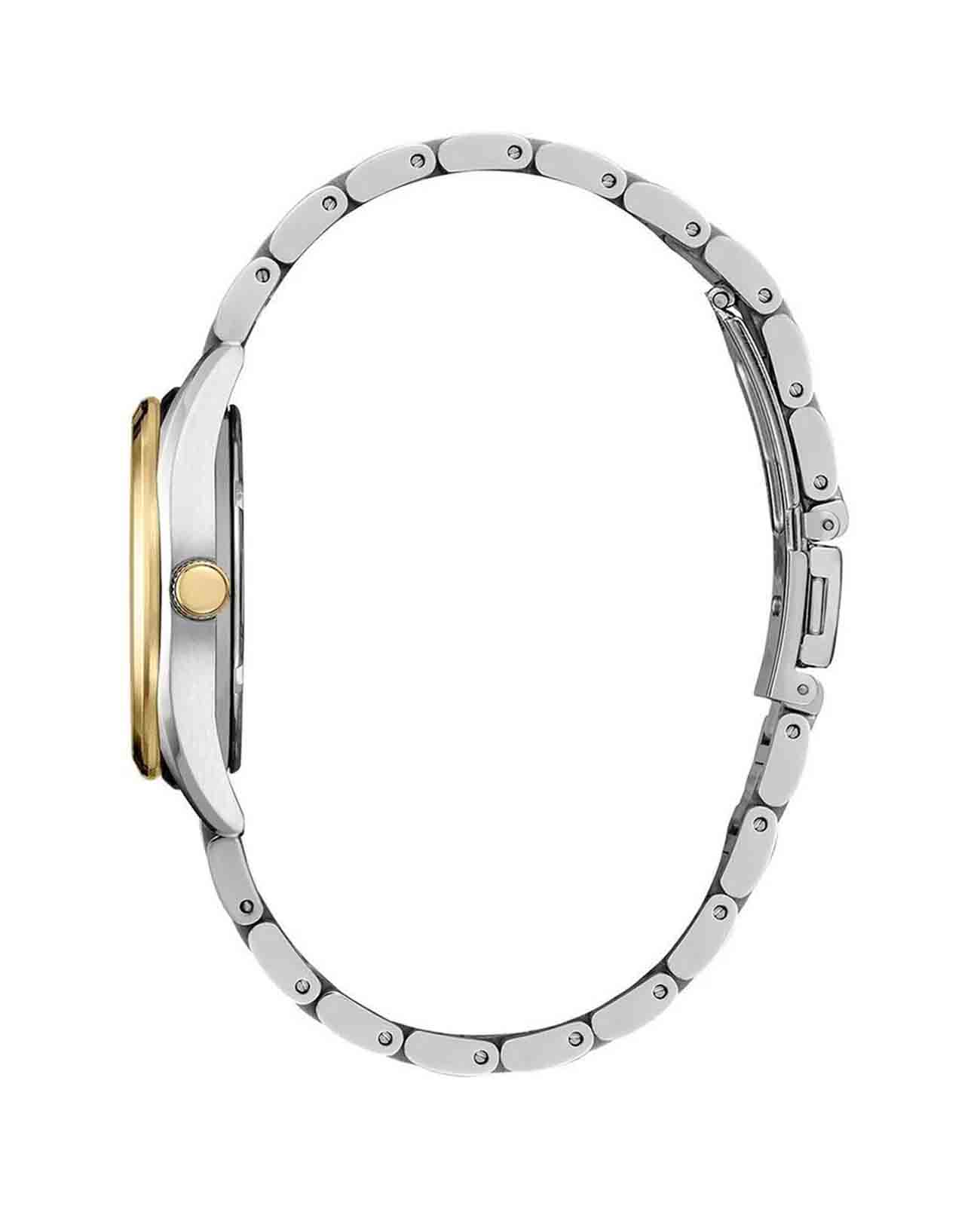 Стальной браслет с частичным PVD-покрытиемPVDУльтратонкое покрытие наносится в технике вакуумного напыления, сочетает в себе нитрид титана особой прочности со слоем золота или оксида хрома. Несёт в себе декоративную или защитную функцию. завершает образ запястья, обеспечивая не только изысканный вид, но и удобство благодаря раскладной застёжкеРаскладная застёжкаТакой тип застёжки используется только на браслетах из металла. Она никогда не раскрывается полностью, происходит разделение на 2 и более частей. Раскладывающая застёжка снизит вероятность потери часов к минимуму.. Эти часы станут жемчужиной вашей коллекции, прекрасно дополняя любой образ и подчеркивая ваш стиль.