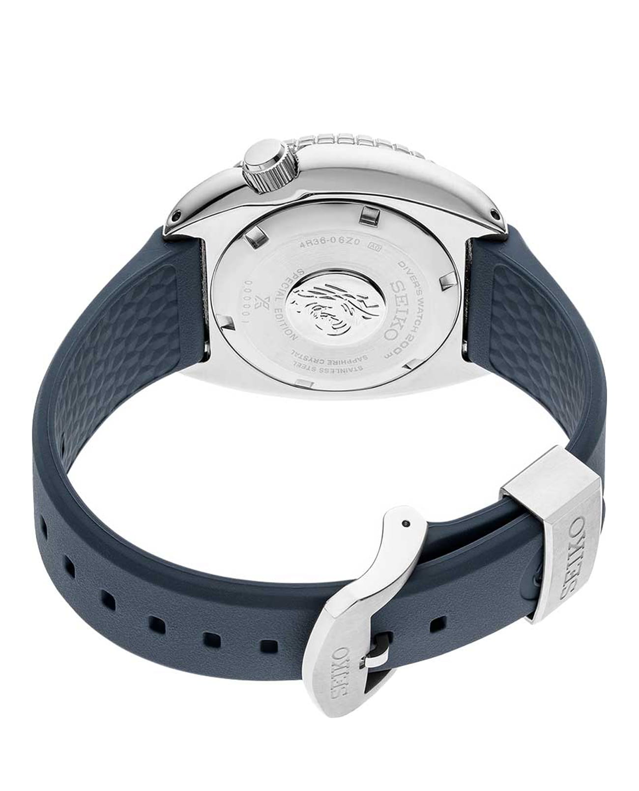 Seiko Prospex SRPF77K1 — профессиональная дайверская модель, созданная для надёжной работы в экстремальных условиях. Корпус диаметром 45 мм выполнен из нержавеющей стали с защитной «черепахообразной» формой, а односторонний вращающийся безельБезельВнешний ободок, закрепляющий стекло. В спортивных часах так называется поворотное кольцо с делениями на циферблате, выполняет роль таймера – замеряет отрезки времени на шкале. Неподвижный безель – элемент декора. Однонаправленно вращающийся безель на дайверских часах позволяет фиксировать моменты погружения и выныривания на поверхность. с PVD-покрытиемPVDУльтратонкое покрытие наносится в технике вакуумного напыления, сочетает в себе нитрид титана особой прочности со слоем золота или оксида хрома. Несёт в себе декоративную или защитную функцию. с минутной разметкой позволяет контролировать время погружения. Защитную функцию выполняет сапфировое стеклоСапфировое стеклоПрочный и надёжный материал из кристалла сапфира синтетического происхождения, характеризующийся особой твёрдостью и устойчивостью к царапинам и повреждениям. с увеличительной линзой над апертурой даты и дня недели в позиции «3 часа». В основе лежит автоматический механизм калибра 4R36 с функциями часов, минут, секунд, даты и дня недели, а также возможностью ручного завода и стоп-секундой. Водозащита 200 м (20 бар) соответствует профессиональным стандартам ISO для дайверских часов. Крупные стрелки и метки покрыты люминесцентным покрытиемЛюминесцентное покрытиеПозволяет считывать показания времени в темноте. Производители наносят на стрелки, часовые индексы, безель или поверхность циферблата светонакопительный состав, дающий холодное свечение., что обеспечивает превосходную читаемость под водой и в темноте. Часы комплектуются каучуковым ремешком с классической застёжкой, который гарантирует комфорт и устойчивость к влаге.