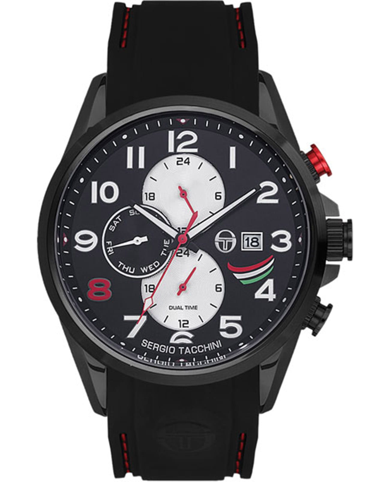 Мужские кварцевые часы Sergio Tacchini из коллекции Archivio — это надёжный спортивный аксессуар с функциональным дизайном. Корпус диаметром 46,5 мм выполнен из нержавеющей стали 316L с PVD-покрытиемPVDУльтратонкое покрытие наносится в технике вакуумного напыления, сочетает в себе нитрид титана особой прочности со слоем золота или оксида хрома. Несёт в себе декоративную или защитную функцию.. Циферблат чёрного цвета оформлен индексами и стрелками. Указатели дня недели и даты вынесены на отдельные субциферблаты, также присутствует индикация 24-часового формата времени и второй часовой пояс. Стрелки с люминесцентным покрытиемЛюминесцентное покрытиеПозволяет считывать показания времени в темноте. Производители наносят на стрелки, часовые индексы, безель или поверхность циферблата светонакопительный состав, дающий холодное свечение., обеспечивающим хорошую читаемость в темноте. Циферблат защищён минеральным стекломМинеральное стеклоМинеральное стекло представляет собой искусственно выращенный минерал кварца. Такое стекло отличается особой устойчивостью к повреждениям и царапинам. Уступает по некоторым качествам сапфировому стеклу. с антибликовым покрытиемАнтибликовое покрытиеСлой оксида металла в 0,13-0,3 микрон, благодаря которому стекло часов не бликует и не отражает свет. Антибликовое покрытие уменьшает отражение света в 10 раз, обеспечивая отличную читаемость показателей циферблата.. Часы оснащены силиконовым ремешком чёрного цвета с стандартной застёжкой. Водонепроницаемость 50 м позволяет использовать часы в повседневных условиях. Идеальный выбор для тех, кто ценит стиль, функциональность и комфорт.