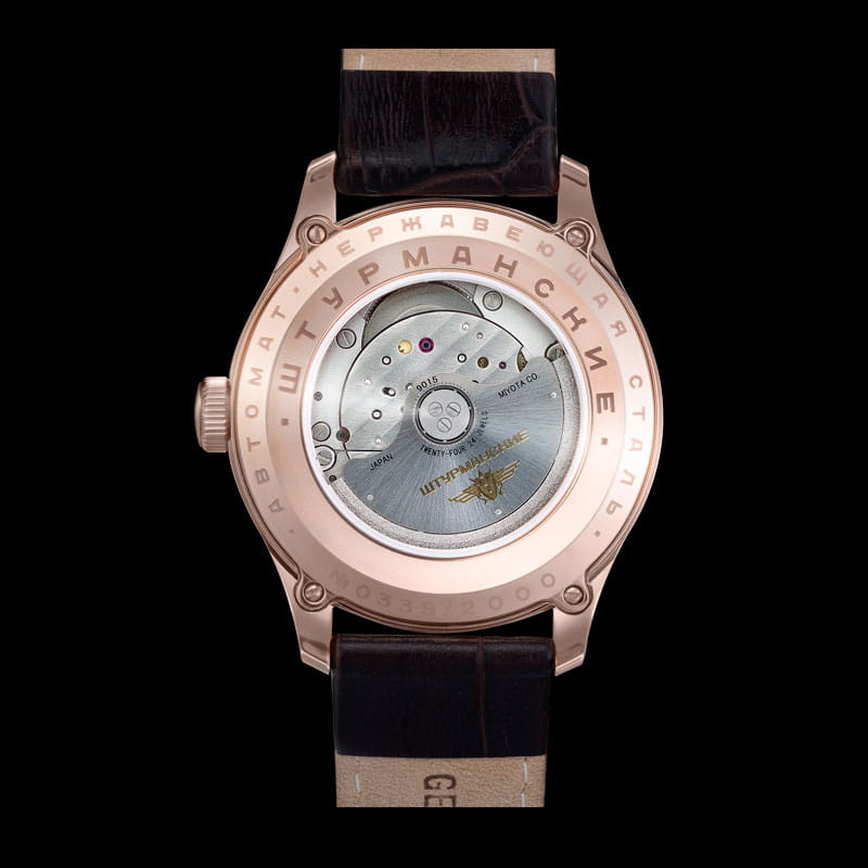 Мужские российские механические часы с минеральным стекломМинеральное стеклоМинеральное стекло представляет собой искусственно выращенный минерал кварца. Такое стекло отличается особой устойчивостью к повреждениям и царапинам. Уступает по некоторым качествам сапфировому стеклу. Штурманские Гагарин 9015/1279164, механизм с высокой точностью. Класс водозащиты: 50 метров, позволит защитить корпус от случайных брызг или капель дождя. Корпус часов изготовлен из стали с PVD-покрытиемPVDУльтратонкое покрытие наносится в технике вакуумного напыления, сочетает в себе нитрид титана особой прочности со слоем золота или оксида хрома. Несёт в себе декоративную или защитную функцию.. Кожаный ремешок на стандартной застёжке. Стрелки и метки с люминесцентным покрытиемЛюминесцентное покрытиеПозволяет считывать показания времени в темноте. Производители наносят на стрелки, часовые индексы, безель или поверхность циферблата светонакопительный состав, дающий холодное свечение.. Калибр Miyota 9015. В механизме 24 камня, частота 28800 полуколебаний в час. Запас хода 42 часа. Апертура даты.