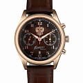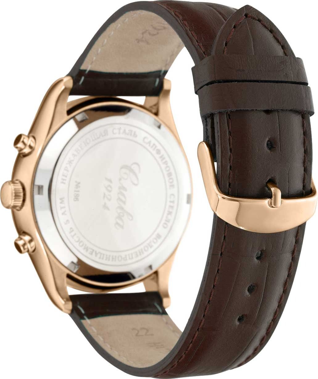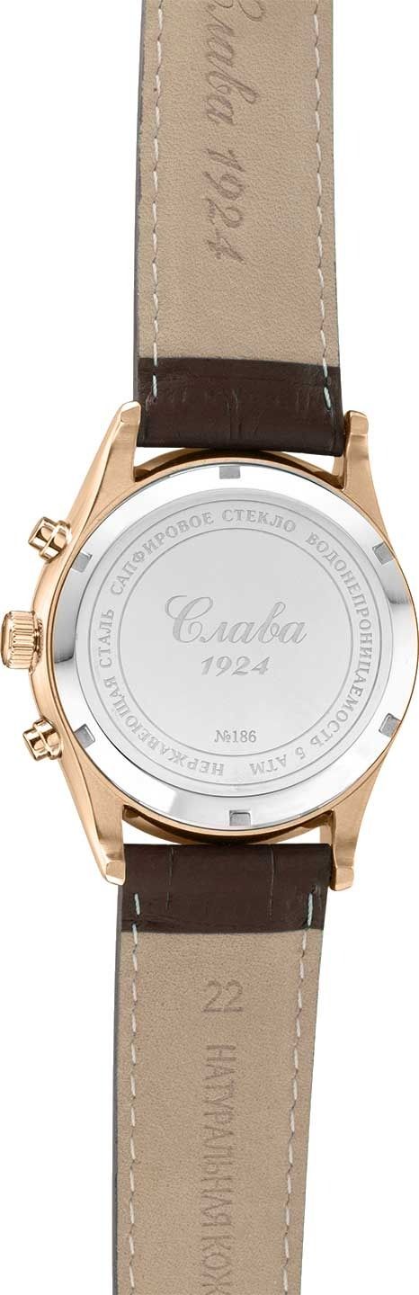 Российские механические часы-хронографХронографФункция позволяет измерять отрезки времени с особой точностью: часы, минуты, секунды. Верным признаком хронографа является наличие на циферблате 3 дополнительных окошек-счётчиков. с секундомеромСекундомерСекундоме́р — прибор, способный измерять интервалы времени с точностью до долей секунды. Слава 1883142/300-4617, созданные для тех, кто ценит стиль и надежность. Эти часы сочетают в себе классический дизайн и современные технологии, предлагая исключительную функциональность и элегантность. Часы оснащены механизмом Peacock 4617 с автоподзаводом, а запас хода достигает 45 часов, что делает их идеальным выбором для повседневного использования. Корпус часов диаметром 42 мм выполнен из стали с изысканным розовым IP-покрытиемIP-покрытиеМетод ионного напыления. Демонстрирует повышенную устойчивость к истиранию, окислению и химическим веществам. Под воздействием высокого давления и температуры около 1500°C молекулы металла надёжно соединяются с частицами корпуса часов.. Коричневый циферблат украшен изображением герба Российской Федерации и дополнен арабскими цифрами, что обеспечивает отличную читаемость. Стрелки с люминесцентным покрытиемЛюминесцентное покрытиеПозволяет считывать показания времени в темноте. Производители наносят на стрелки, часовые индексы, безель или поверхность циферблата светонакопительный состав, дающий холодное свечение. облегчают чтение времени даже в условиях слабого освещения. Окошко даты расположено в положении 6 часов, добавляя дополнительную практичность. Защиту обеспечивает сапфировое стеклоСапфировое стеклоПрочный и надёжный материал из кристалла сапфира синтетического происхождения, характеризующийся особой твёрдостью и устойчивостью к царапинам и повреждениям., устойчивое к царапинам, и водозащита до 50WR, что позволяет носить часы в различных условиях. Рифленая заводная головка и кожаный ремешок с классической застежкой завершают образ, придавая часам дополнительную элегантность и комфорт.