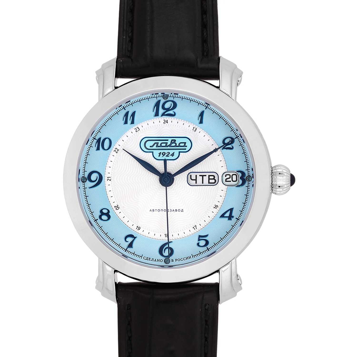 Наручные часы Слава Слава России 2440616/300-2427 — воплощение классического стиля и исключительного качества, произведенные в России. Эта модель из лимитированной коллекции, выпущенной в количестве всего 300 экземпляров, станет великолепным дополнением к вашему образу. Часы оснащены надежным механическим механизмом "Слава 2427" с автоподзаводом, обеспечивающим точный ход и оснащены двойным календарем, что позволяет всегда быть в курсе текущей даты. Корпус из нержавеющей стали с родиевым покрытием диаметром 41 мм и толщиной 14,2 мм отличается высокой прочностью и водозащитой до 5 ATM. Серебристо-голубой циферблат с арабскими цифрами защищен сапфировым стекломСапфировое стеклоПрочный и надёжный материал из кристалла сапфира синтетического происхождения, характеризующийся особой твёрдостью и устойчивостью к царапинам и повреждениям., устойчивым к царапинам, что позволяет надолго сохранить безупречный вид часов. На 3 часах расположено окошко с указателем даты и дня недели. Кожаный ремень из крокодила с застежкой «бабочка»Застёжка "бабочка"Такой вид застёжки дополняется предохранителями, помогающими избежать случайного раскрытия браслета. Обладают изящным исполнением. добавляет элегантности и комфорта, создавая ощущение роскоши и изысканности. Эта модель станет идеальным выбором для тех, кто ценит традиции и высокое качество в сочетании с современным дизайном.