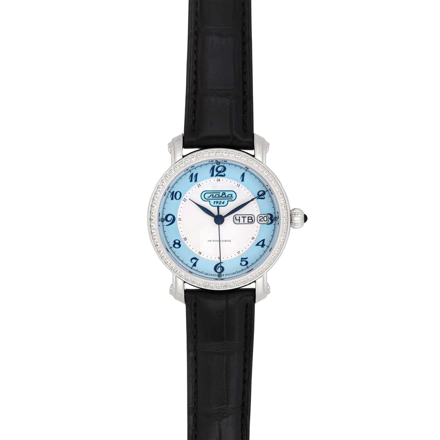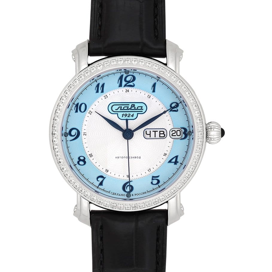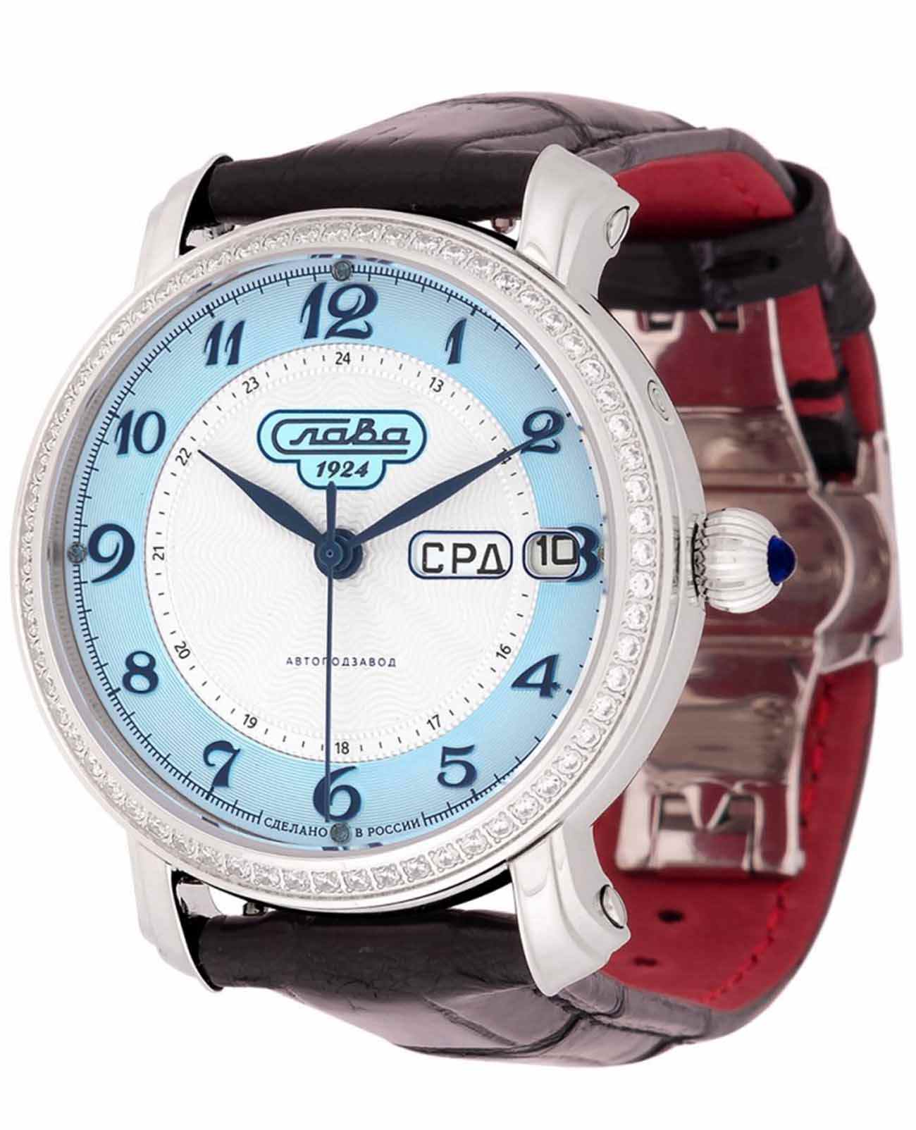 Наручные часы Слава Слава России 7440616/300-2427-68 — воплощение классического стиля и исключительного качества, произведенные в России. Эта модель из лимитированной коллекции станет великолепным дополнением к вашему образу. Часы оснащены надежным механическим механизмом "Слава 2427" с автоподзаводом, обеспечивающим точный ход и оснащены двойным календарем, что позволяет всегда быть в курсе текущей даты. Корпус из нержавеющей стали с родиевым покрытием диаметром 41 мм и толщиной 14,2 мм отличается высокой прочностью и водозащитой до 5 ATM. БезельБезельВнешний ободок, закрепляющий стекло. В спортивных часах так называется поворотное кольцо с делениями на циферблате, выполняет роль таймера – замеряет отрезки времени на шкале. Неподвижный безель – элемент декора. Однонаправленно вращающийся безель на дайверских часах позволяет фиксировать моменты погружения и выныривания на поверхность. часов с вставками из камней циркона. Серебристо-голубой циферблат с арабскими цифрами защищен сапфировым стекломСапфировое стеклоПрочный и надёжный материал из кристалла сапфира синтетического происхождения, характеризующийся особой твёрдостью и устойчивостью к царапинам и повреждениям., устойчивым к царапинам, что позволяет надолго сохранить безупречный вид часов. На 3 часах расположено окошко с указателем даты и дня недели. Кожаный ремень из крокодила с застежкой «бабочка»Застёжка "бабочка"Такой вид застёжки дополняется предохранителями, помогающими избежать случайного раскрытия браслета. Обладают изящным исполнением. добавляет элегантности и комфорта, создавая ощущение роскоши и изысканности. Эта модель станет идеальным выбором для тех, кто ценит традиции и высокое качество в сочетании с современным дизайном.