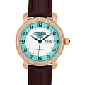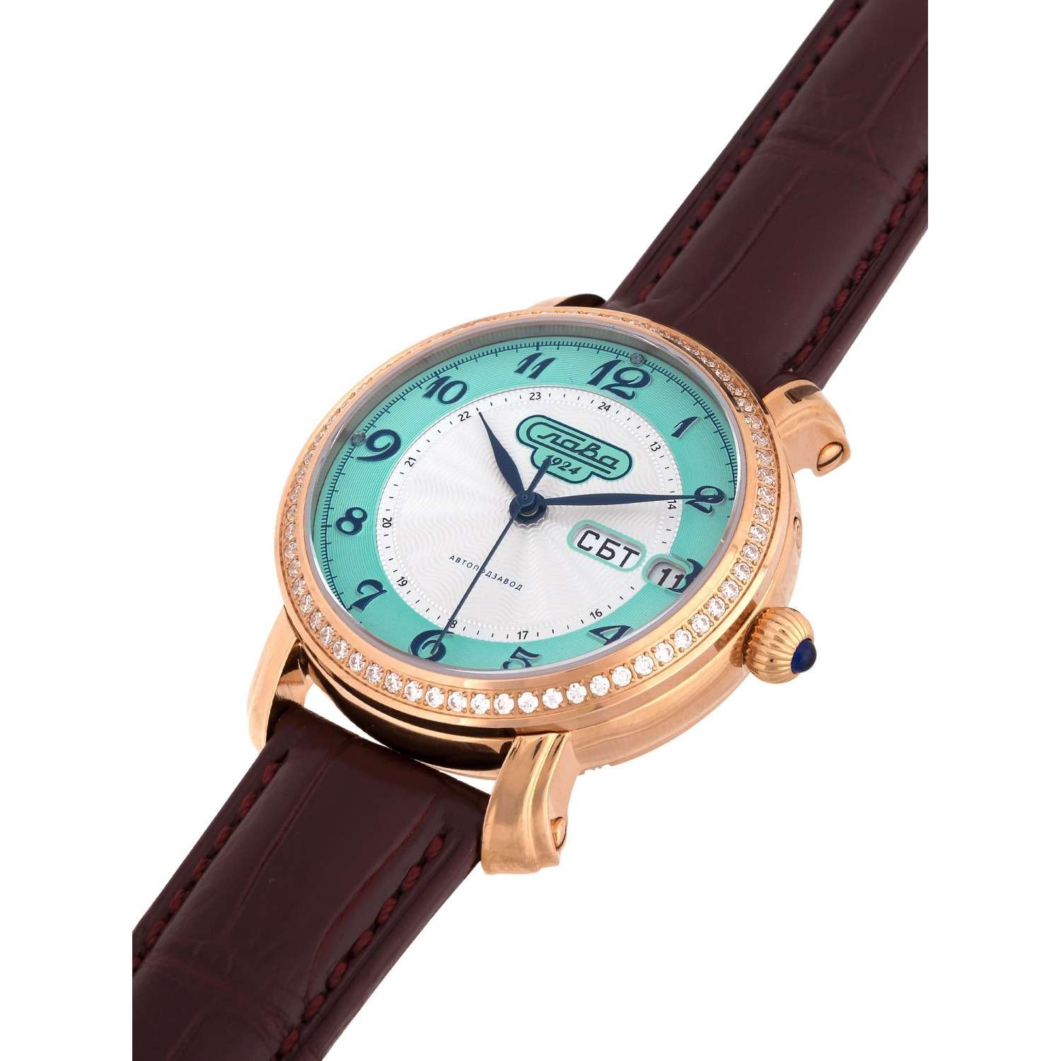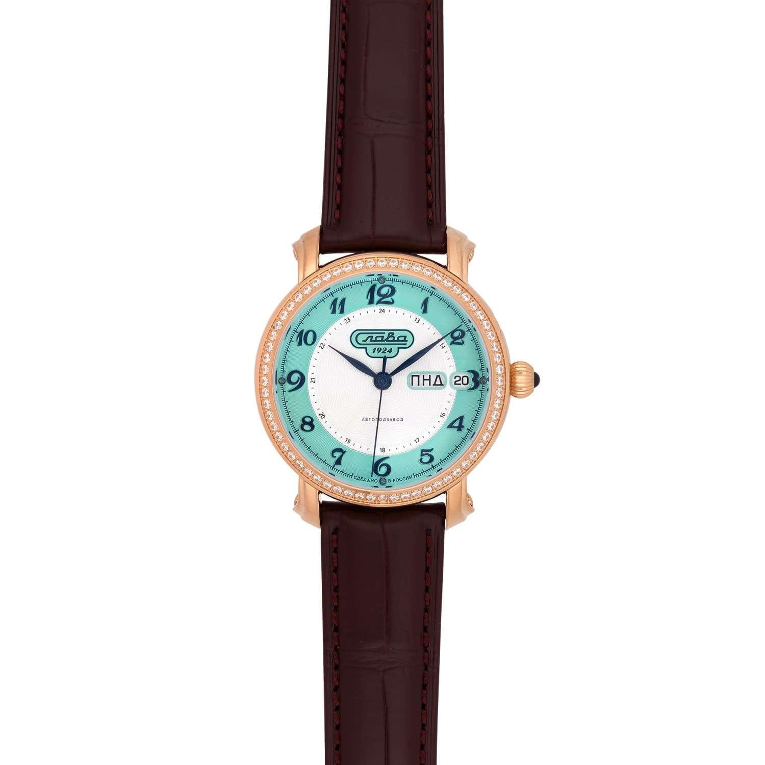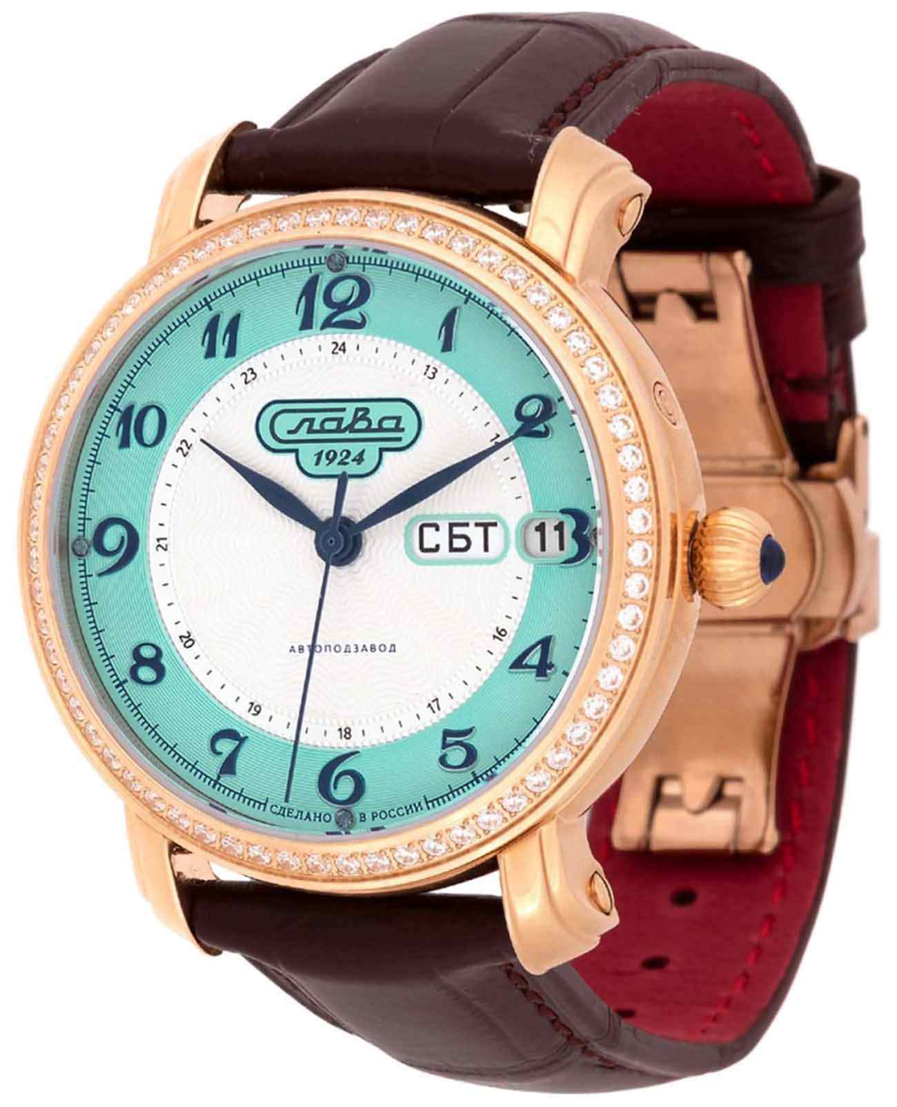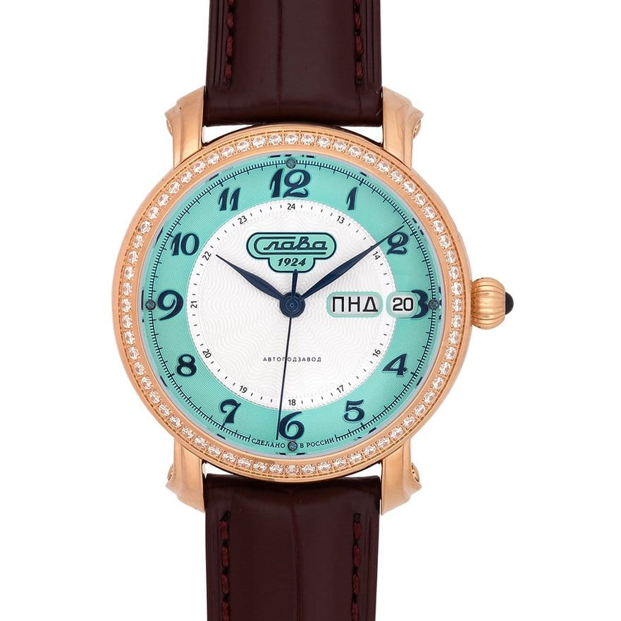 Наручные часы Слава Слава России 7443617/300-2427-68 — воплощение классического стиля и исключительного качества, произведенные в России. Эта модель из лимитированной коллекции станет великолепным дополнением к вашему образу. Часы оснащены надежным механическим механизмом "Слава 2427" с автоподзаводом, обеспечивающим точный ход и оснащены двойным календарем, что позволяет всегда быть в курсе текущей даты. Корпус из нержавеющей стали с золотистым PVDPVDУльтратонкое покрытие наносится в технике вакуумного напыления, сочетает в себе нитрид титана особой прочности со слоем золота или оксида хрома. Несёт в себе декоративную или защитную функцию.-покрытием диаметром 41 мм и толщиной 14,2 мм отличается высокой прочностью и водозащитой до 5 ATM.  БезельБезельВнешний ободок, закрепляющий стекло. В спортивных часах так называется поворотное кольцо с делениями на циферблате, выполняет роль таймера – замеряет отрезки времени на шкале. Неподвижный безель – элемент декора. Однонаправленно вращающийся безель на дайверских часах позволяет фиксировать моменты погружения и выныривания на поверхность. часов с вставками из камней циркона. Серебристо-бирюзовый циферблат с арабскими цифрами защищен сапфировым стекломСапфировое стеклоПрочный и надёжный материал из кристалла сапфира синтетического происхождения, характеризующийся особой твёрдостью и устойчивостью к царапинам и повреждениям., устойчивым к царапинам, что позволяет надолго сохранить безупречный вид часов. На 3 часах расположено окошко с указателем даты и дня недели. Кожаный ремень из крокодила с застежкой «бабочка»Застёжка "бабочка"Такой вид застёжки дополняется предохранителями, помогающими избежать случайного раскрытия браслета. Обладают изящным исполнением. добавляет элегантности и комфорта, создавая ощущение роскоши и изысканности. Эта модель станет идеальным выбором для тех, кто ценит традиции и высокое качество в сочетании с современным дизайном.