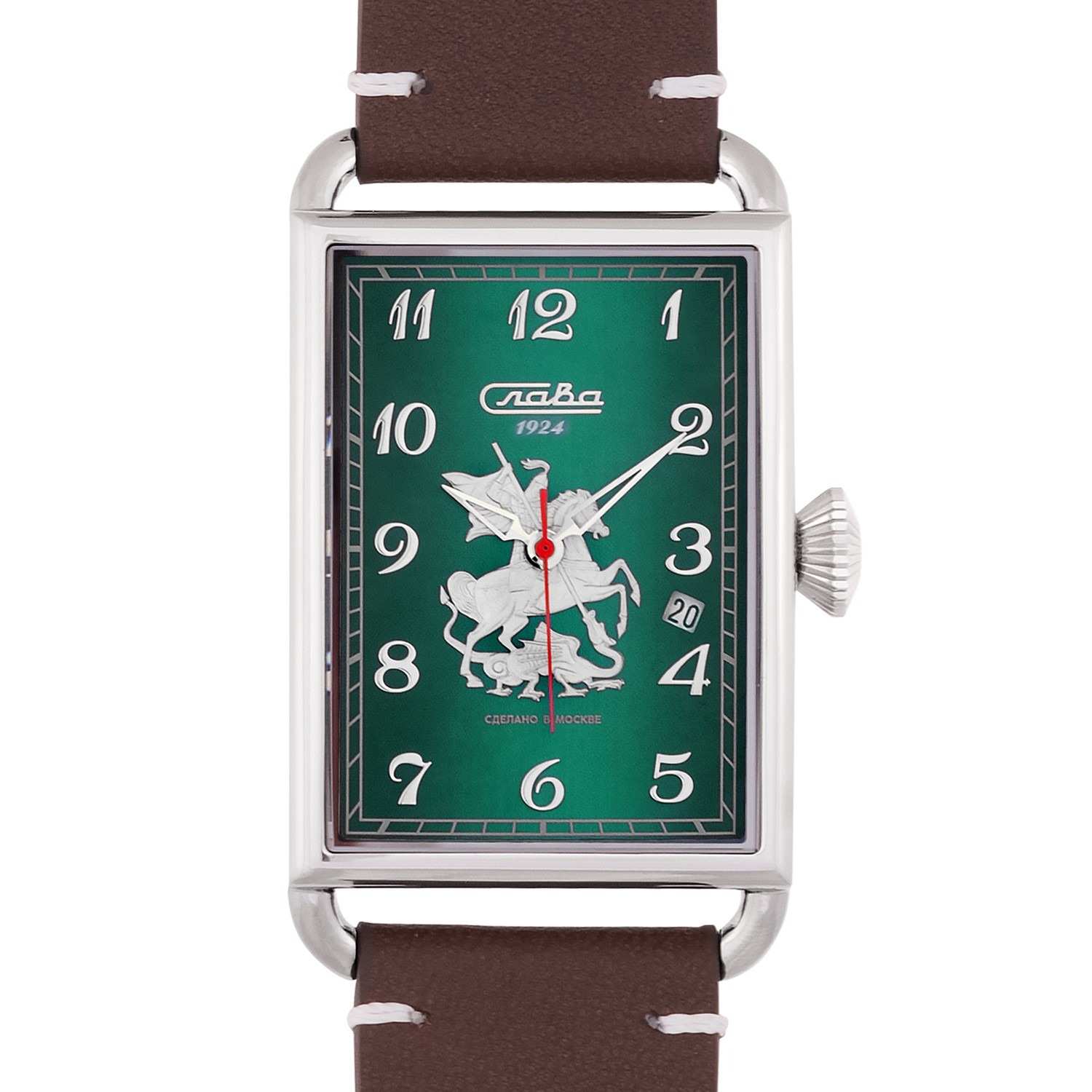 Часы Слава Москва 8700783/300-2414 — это воплощение элегантности и стиля, которое станет идеальным дополнением к вашему деловому гардеробу. Созданные в России, они оснащены надежным механическим механизмом калибра Слава 2414. Корпус выполнен из высококачественной стали, что обеспечивает долговечность и изысканный внешний вид. Зеленый циферблат украшен изображением Георгия Победоносца и защищен прочным сапфировым стекломСапфировое стеклоПрочный и надёжный материал из кристалла сапфира синтетического происхождения, характеризующийся особой твёрдостью и устойчивостью к царапинам и повреждениям., которое устойчиво к царапинам. Арабские цифры и окошко даты, расположенное между отметками 3 и 4 часа, добавляют функциональности и удобства в использовании. Задняя крышка, крепящаяся на 4 винтах, украшена надписью «Москва», подчеркивая уникальность и оригинальность модели. Кожаный ремешок с классической застежкой и системой быстрой замены не только обеспечивает комфорт, но и позволяет легко менять его по вашему желанию. Часы обладают водозащитой 50WR, что делает их подходящими для ежедневного ношения. Компактные габариты и вес в 70 грамм делают их удобными и практически незаметными на запястье. Эта лимитированная серия выпущена в количестве всего 500 экземпляров, что придает особую ценность и эксклюзивность вашему выбору. Часы поставляются в стильной подарочной упаковке, что делает их отличным подарком для ценителей высокого качества и утонченного дизайна.