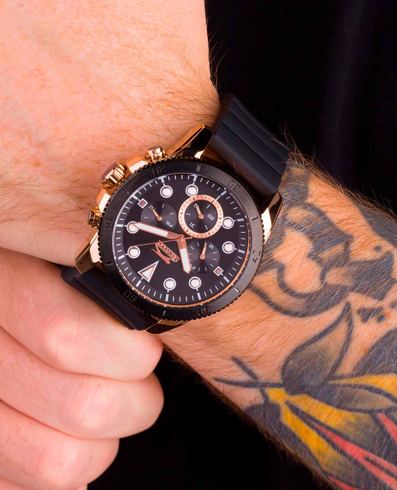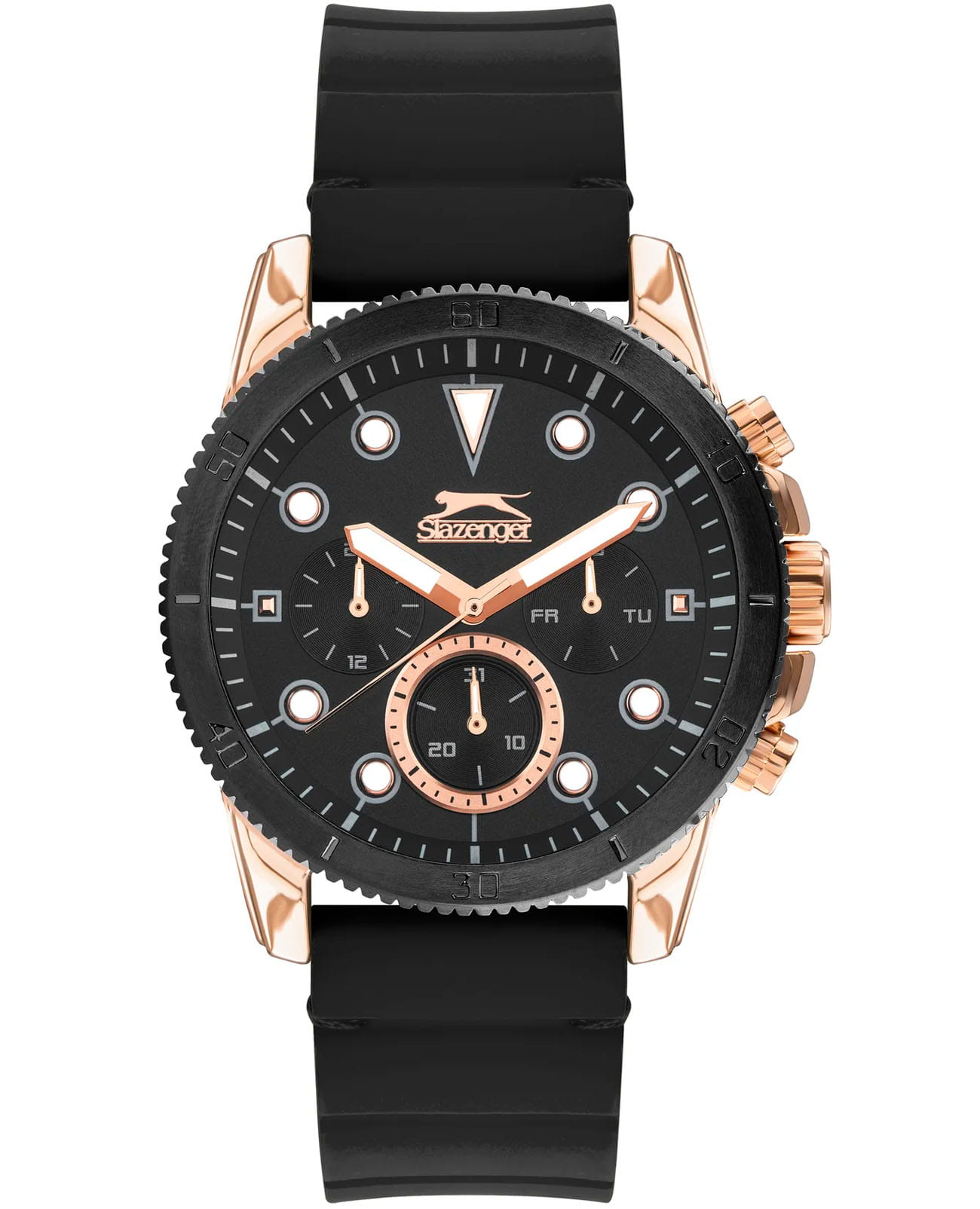 Мужские наручные часы Slazenger SL.09.2012.2.04 сочетают в себе спортивный дизайн и функциональность современных технологий. Модель обладает круглым корпусом диаметром 47 мм, изготовленным из суперметалла с IP-покрытиемIP-покрытиеМетод ионного напыления. Демонстрирует повышенную устойчивость к истиранию, окислению и химическим веществам. Под воздействием высокого давления и температуры около 1500°C молекулы металла надёжно соединяются с частицами корпуса часов., что обеспечивает высокую устойчивость к внешним воздействиям. Браслет выполнен из черного силикона, а застежка стандартная, гарантирующая комфортное ношение и безопасность. Черный циферблат дополнен индексами и тремя малыми циферблатами для отображения даты, дня недели и времени в формате 24 часа, а также защищен прочным минеральным стекломМинеральное стеклоМинеральное стекло представляет собой искусственно выращенный минерал кварца. Такое стекло отличается особой устойчивостью к повреждениям и царапинам. Уступает по некоторым качествам сапфировому стеклу. с люминесцентным покрытиемЛюминесцентное покрытиеПозволяет считывать показания времени в темноте. Производители наносят на стрелки, часовые индексы, безель или поверхность циферблата светонакопительный состав, дающий холодное свечение. для лучшей видимости в темноте. Часы работают на кварцевом механизме, что гарантирует точное время без необходимости подзаводки. БезельБезельВнешний ободок, закрепляющий стекло. В спортивных часах так называется поворотное кольцо с делениями на циферблате, выполняет роль таймера – замеряет отрезки времени на шкале. Неподвижный безель – элемент декора. Однонаправленно вращающийся безель на дайверских часах позволяет фиксировать моменты погружения и выныривания на поверхность. с IP-покрытиемIP-покрытиеМетод ионного напыления. Демонстрирует повышенную устойчивость к истиранию, окислению и химическим веществам. Под воздействием высокого давления и температуры около 1500°C молекулы металла надёжно соединяются с частицами корпуса часов.. Водонепроницаемость часов достигает уровня 5 атмосфер (WR50), что позволяет использовать их во время плавания, однако не рекомендуется для глубоководного дайвинга.