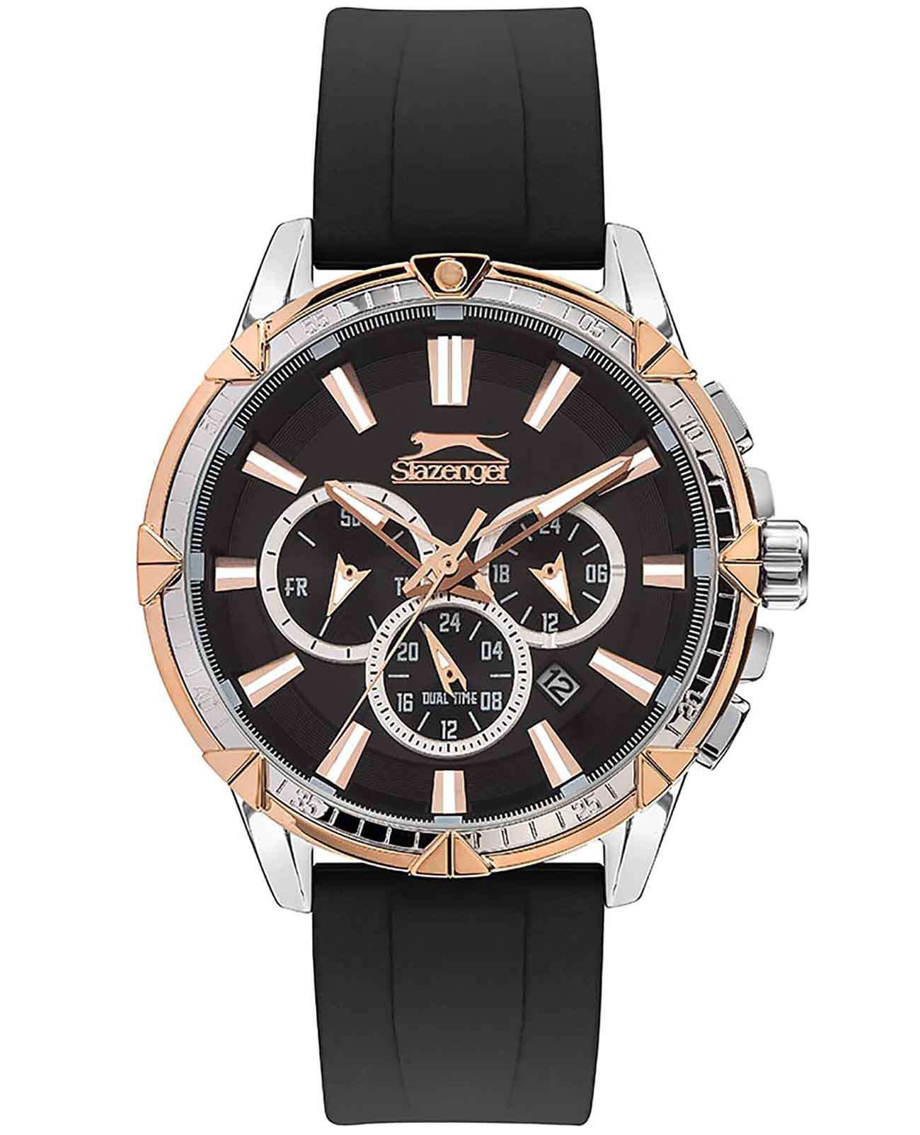 Мужские часы Slazenger SL.09.2090.2.04 представляют собой идеальное сочетание стиля и функциональности. Черный циферблат, обрамленный корпусом из суперметалла диаметром 46 мм и золотистым безелемБезельВнешний ободок, закрепляющий стекло. В спортивных часах так называется поворотное кольцо с делениями на циферблате, выполняет роль таймера – замеряет отрезки времени на шкале. Неподвижный безель – элемент декора. Однонаправленно вращающийся безель на дайверских часах позволяет фиксировать моменты погружения и выныривания на поверхность. также из суперметалла, но с IP-покрытиемIP-покрытиеМетод ионного напыления. Демонстрирует повышенную устойчивость к истиранию, окислению и химическим веществам. Под воздействием высокого давления и температуры около 1500°C молекулы металла надёжно соединяются с частицами корпуса часов., привлекает внимание своим современным дизайном. Кварцевый механизм обеспечивает точность хода. Силиконовый браслет черного цвета добавляет комфорта и надежности, идеально сочетаясь с цветом циферблата. Минеральное стеклоМинеральное стеклоМинеральное стекло представляет собой искусственно выращенный минерал кварца. Такое стекло отличается особой устойчивостью к повреждениям и царапинам. Уступает по некоторым качествам сапфировому стеклу. защищает часы от царапин, а люминесцентное покрытиеЛюминесцентное покрытиеПозволяет считывать показания времени в темноте. Производители наносят на стрелки, часовые индексы, безель или поверхность циферблата светонакопительный состав, дающий холодное свечение. на стрелках и метках обеспечивает видимость в темноте. Функциональность часов дополнена вторым часовым поясомВторой часовой поясФункция, позволяющая отображать время двух часовых поясов одновременно., 24-часовым указателем времени, календарем даты в районе отметки «4:30» и дня недели. А водозащита до 5 ATM позволяет использовать часы в различных условиях.