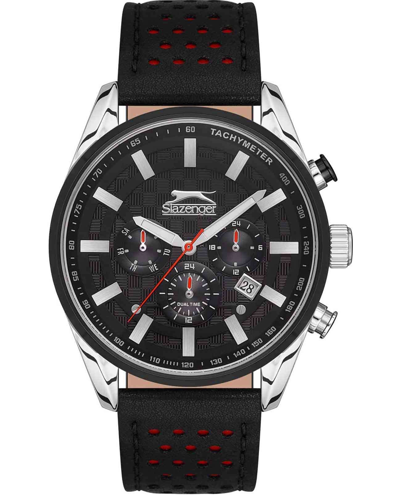Мужские часы Slazenger SL.09.2096.2.03 — это воплощение элегантности и надежности, идеальные для современного мужчины. Черный циферблат гармонично сочетается с корпусом из суперметалла и черным безелемБезельВнешний ободок, закрепляющий стекло. В спортивных часах так называется поворотное кольцо с делениями на циферблате, выполняет роль таймера – замеряет отрезки времени на шкале. Неподвижный безель – элемент декора. Однонаправленно вращающийся безель на дайверских часах позволяет фиксировать моменты погружения и выныривания на поверхность. также из суперметалла, но с IP-покрытиемIP-покрытиеМетод ионного напыления. Демонстрирует повышенную устойчивость к истиранию, окислению и химическим веществам. Под воздействием высокого давления и температуры около 1500°C молекулы металла надёжно соединяются с частицами корпуса часов., создавая утонченный и стильный внешний вид. Кварцевый механизм гарантирует безупречную точность. Черный кожаный браслет с комфортной посадкой подчеркивает классический стиль и добавляет изысканности. Минеральное стеклоМинеральное стеклоМинеральное стекло представляет собой искусственно выращенный минерал кварца. Такое стекло отличается особой устойчивостью к повреждениям и царапинам. Уступает по некоторым качествам сапфировому стеклу. защищает часы от повреждений, а люминесцентное покрытиеЛюминесцентное покрытиеПозволяет считывать показания времени в темноте. Производители наносят на стрелки, часовые индексы, безель или поверхность циферблата светонакопительный состав, дающий холодное свечение. на стрелках и метках обеспечивает отличную видимость даже в условиях недостаточного освещения. Эти часы оснащены множеством полезных функций, включая 24-часовой указатель времени, второй часовой поясВторой часовой поясФункция, позволяющая отображать время двух часовых поясов одновременно., индикаторы даты и дня недели, а также тахиметрТахиметрРазмеченная шкала, располагается на ободке или безеле часов. Тахиметр позволяет рассчитать скорость на определённом участке пути, расстояние измеряется в километрах или милях. для измерения скорости. А водозащита до 5 ATM позволяет не беспокоиться о случайных попаданиях воды.