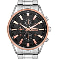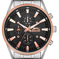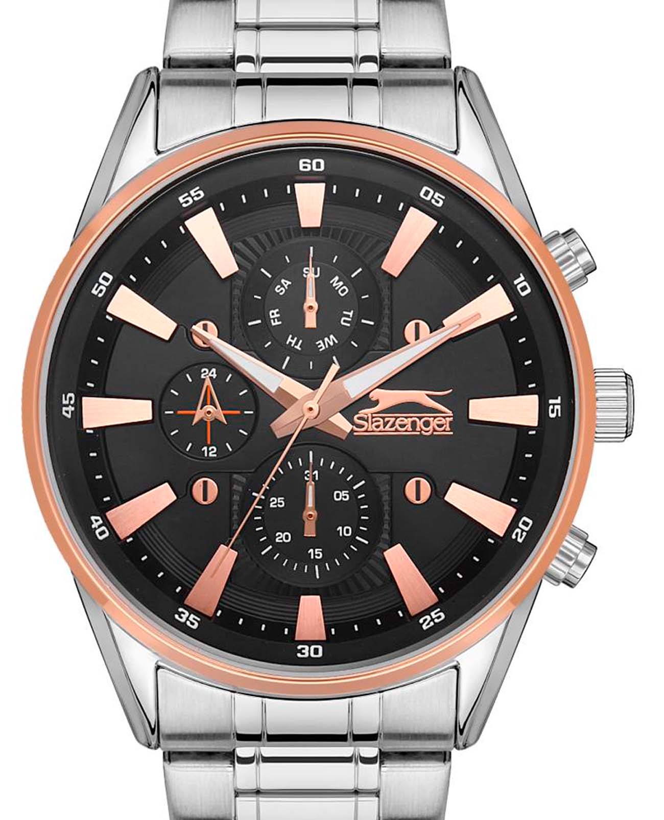 Мужские наручные часы Slazenger SL.09.2118.2.03 сочетают в себе классический дизайн и надежность современных технологий. Модель обладает круглым корпусом диаметром 46 мм, изготовленным из суперметалла, что обеспечивает высокую устойчивость к внешним воздействиям. БезельБезельВнешний ободок, закрепляющий стекло. В спортивных часах так называется поворотное кольцо с делениями на циферблате, выполняет роль таймера – замеряет отрезки времени на шкале. Неподвижный безель – элемент декора. Однонаправленно вращающийся безель на дайверских часах позволяет фиксировать моменты погружения и выныривания на поверхность. с IP-покрытиемIP-покрытиеМетод ионного напыления. Демонстрирует повышенную устойчивость к истиранию, окислению и химическим веществам. Под воздействием высокого давления и температуры около 1500°C молекулы металла надёжно соединяются с частицами корпуса часов.. Браслет выполнен из стали с раскладной застежкойРаскладной замокДанный вариант застежки используется только на часах с металлическим браслетом. Отличительная особенность такого крепления в том, что длина браслета становится универсальной и вы можете самостоятельно отрегулировать нужный вам размер – застежка просто двигается по браслету часов., гарантирующей комфортное ношение и безопасность. Циферблат черного цвета декорирован стрелками, которые обеспечивают читаемость времени даже в условиях недостаточной освещенности. Для защиты используется минеральное стеклоМинеральное стеклоМинеральное стекло представляет собой искусственно выращенный минерал кварца. Такое стекло отличается особой устойчивостью к повреждениям и царапинам. Уступает по некоторым качествам сапфировому стеклу., обеспечивающее прочную защиту от царапин. Часы работают на кварцевом механизме, что гарантирует точное время без необходимости подзаводки. Модель также оснащена дополнительными функциями: отображением даты, дня недели и текущего времени в 24-часовом формате на малых циферблатах, делая ее практичной для повседневного использования. Водонепроницаемость часов достигает 5 атмосфер (WR50), что позволяет использовать их во время плавания, однако не рекомендуется для дайвинга или других водных видов спорта. Толщина часов составляет 12 мм.