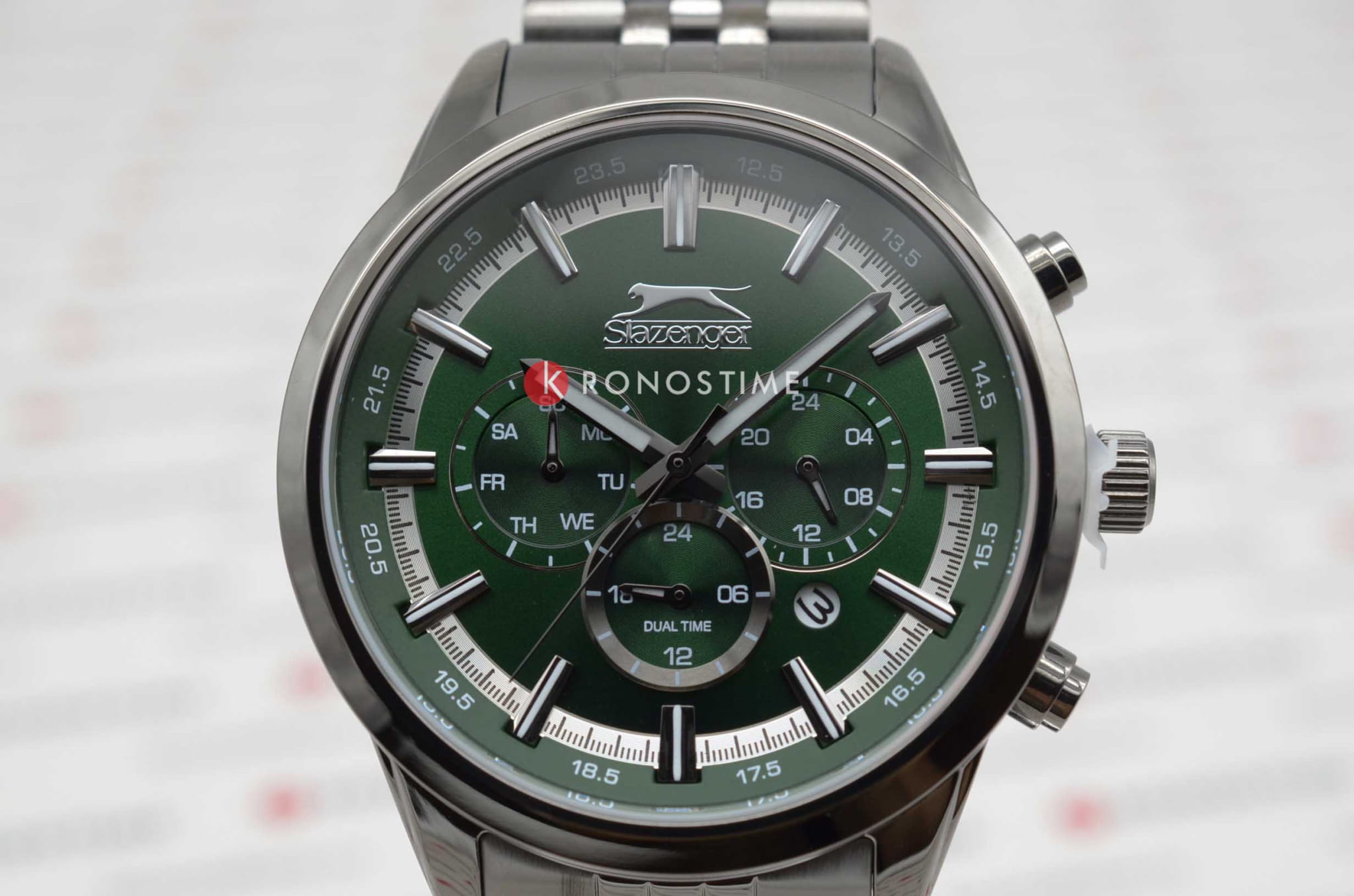 Часы Slazenger SL.09.2131.2.04 воплощают в себе элегантность и практичность, идеально подходящие для современных мужчин. Их зеленый циферблат, защищенный минеральным стекломМинеральное стеклоМинеральное стекло представляет собой искусственно выращенный минерал кварца. Такое стекло отличается особой устойчивостью к повреждениям и царапинам. Уступает по некоторым качествам сапфировому стеклу., заключен в черный матовый корпус диаметром 46 мм, который изготовлен из прочного суперметалла с IP-покрытиемIP-покрытиеМетод ионного напыления. Демонстрирует повышенную устойчивость к истиранию, окислению и химическим веществам. Под воздействием высокого давления и температуры около 1500°C молекулы металла надёжно соединяются с частицами корпуса часов.. Часы оснащены двойным форматом времени (12 и 24 часа), вторым часовым поясом и удобным окошком даты. Надежный кварцевый механизм обеспечивает точность, а водозащита 5 ATM делает их устойчивыми к воздействию воды. Стальной браслет из суперметалла с черным IP-покрытиемIP-покрытиеМетод ионного напыления. Демонстрирует повышенную устойчивость к истиранию, окислению и химическим веществам. Под воздействием высокого давления и температуры около 1500°C молекулы металла надёжно соединяются с частицами корпуса часов. имеет раскладную застёжкуРаскладная застёжкаТакой тип застёжки используется только на браслетах из металла. Она никогда не раскрывается полностью, происходит разделение на 2 и более частей. Раскладывающая застёжка снизит вероятность потери часов к минимуму., что подчеркивает современный стиль и позволяет легко снимать часы. Часы оснащены 24-часовым указателем времени, а также функциями отображения даты и дня недели. Люминесцентное покрытиеЛюминесцентное покрытиеПозволяет считывать показания времени в темноте. Производители наносят на стрелки, часовые индексы, безель или поверхность циферблата светонакопительный состав, дающий холодное свечение. на стрелках и метках обеспечивает отличную видимость в темноте.