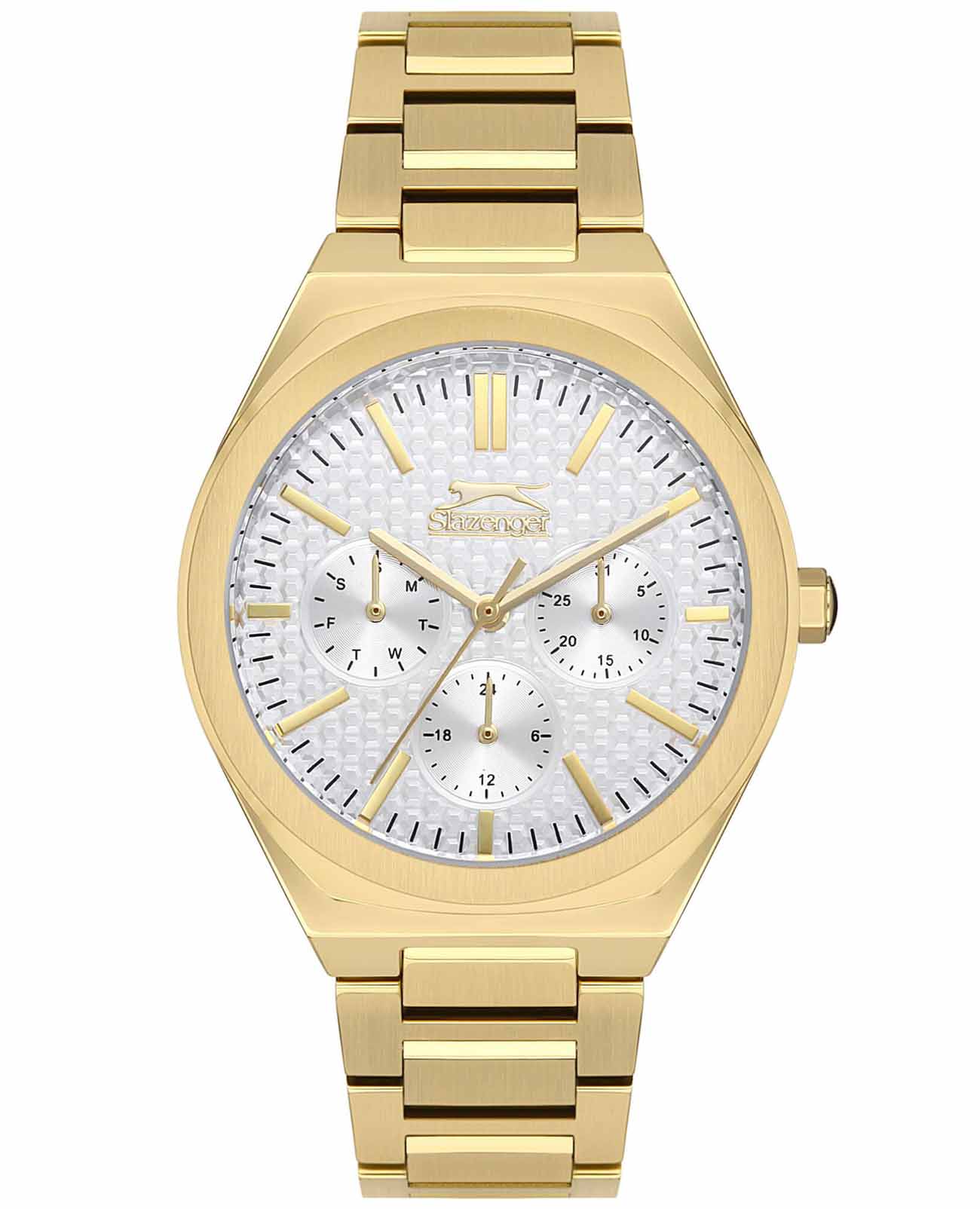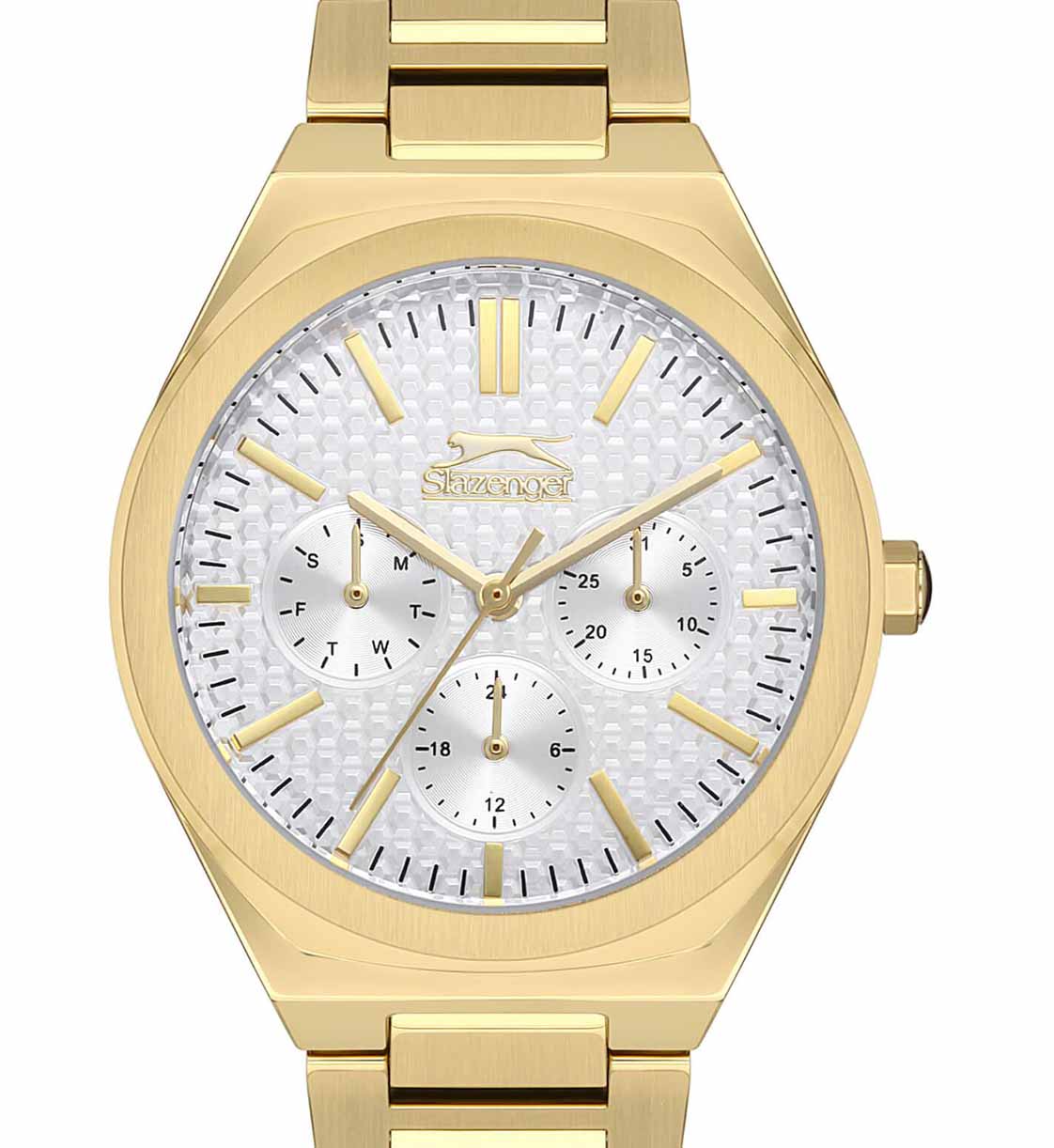 Элегантные женские часы Slazenger SL.09.2138.4.02 воплощают в себе утонченный стиль и функциональность. Их изящный круглый корпус из суперметалла с золотистым IP-покрытиемIP-покрытиеМетод ионного напыления. Демонстрирует повышенную устойчивость к истиранию, окислению и химическим веществам. Под воздействием высокого давления и температуры около 1500°C молекулы металла надёжно соединяются с частицами корпуса часов. гармонично сочетается с изысканным белым циферблатом, создавая неповторимый образ. Минималистичный дизайн подчеркивает чистоту линий и внимание к деталям. Циферблат защищен минеральным стекломМинеральное стеклоМинеральное стекло представляет собой искусственно выращенный минерал кварца. Такое стекло отличается особой устойчивостью к повреждениям и царапинам. Уступает по некоторым качествам сапфировому стеклу., устойчивым к царапинам. Часы имеют надежный кварцевый механизм, обеспечивающий точность хода. Часы оснащены 24-часовым указателем времени, а также дней недели и даты - на дополнительных малых циферблатах. Золотистый браслет из суперметалла IP-покрытиемIP-покрытиеМетод ионного напыления. Демонстрирует повышенную устойчивость к истиранию, окислению и химическим веществам. Под воздействием высокого давления и температуры около 1500°C молекулы металла надёжно соединяются с частицами корпуса часов. идеально облегает запястье. Модель прекрасно дополнит как деловой, так и повседневный образ, став незаменимым аксессуаром для современной женщины, ценящей качество и стиль.