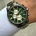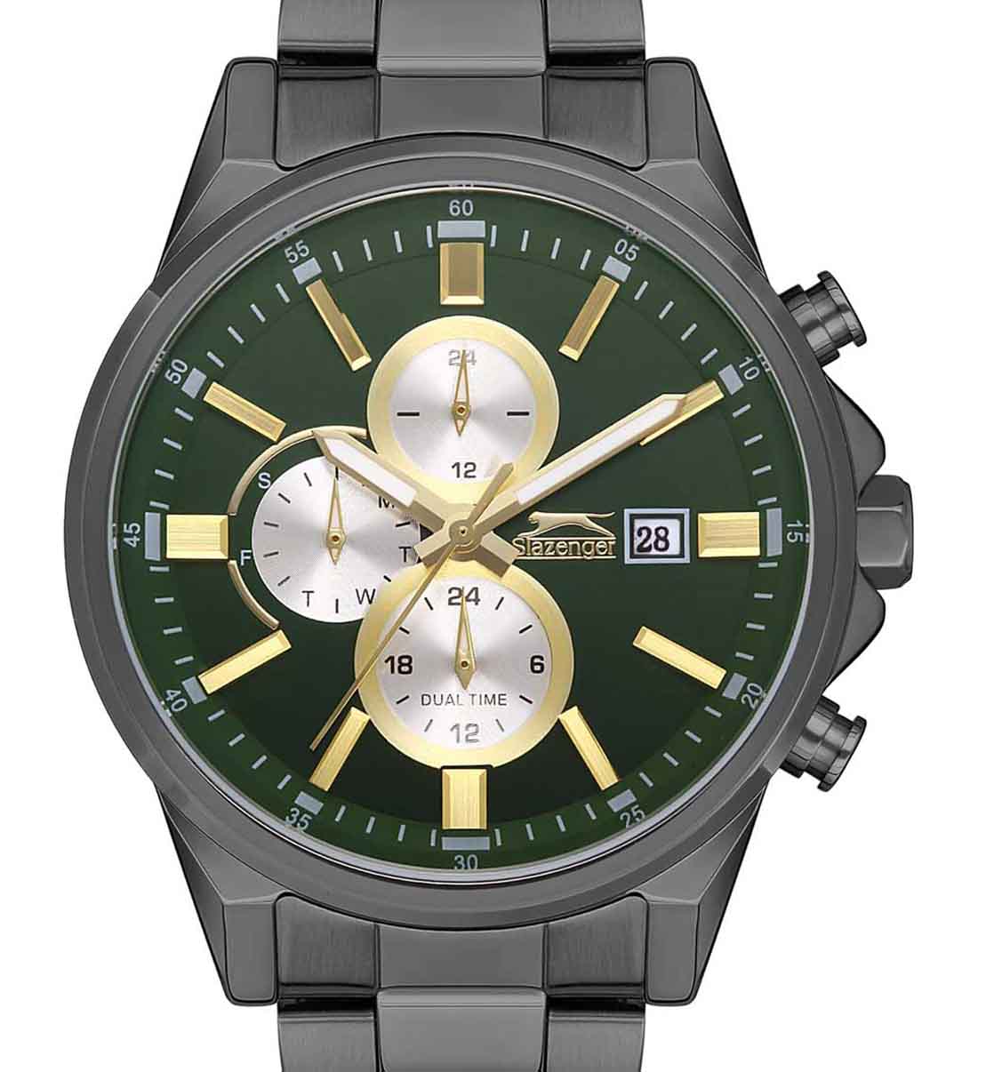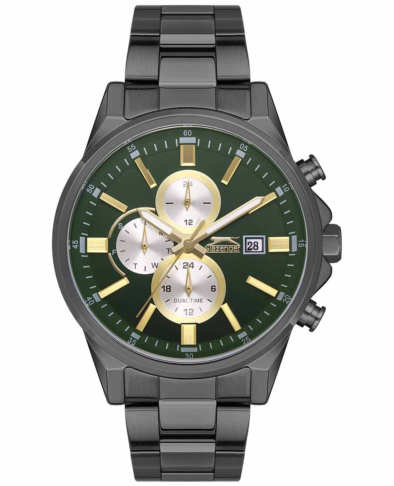 Часы Slazenger SL.09.2139.2.04 воплощают в себе элегантность и практичность, идеально подходящие для современных мужчин. Их зеленый циферблат защищен минеральным стекломМинеральное стеклоМинеральное стекло представляет собой искусственно выращенный минерал кварца. Такое стекло отличается особой устойчивостью к повреждениям и царапинам. Уступает по некоторым качествам сапфировому стеклу. и заключен в серый матовый корпус диаметром 46 мм, который изготовлен из прочного суперметалла с IP-покрытиемIP-покрытиеМетод ионного напыления. Демонстрирует повышенную устойчивость к истиранию, окислению и химическим веществам. Под воздействием высокого давления и температуры около 1500°C молекулы металла надёжно соединяются с частицами корпуса часов.. Часы оснащены указателями второго часового пояса, дня недели и текущего времени в 24-х часовом формате на дополнительных малых циферблатах. Окошко даты расположено в положении 3 часов. Стрелки и метки имеют люминесцентное покрытиеЛюминесцентное покрытиеПозволяет считывать показания времени в темноте. Производители наносят на стрелки, часовые индексы, безель или поверхность циферблата светонакопительный состав, дающий холодное свечение., что позволяет легко считывать время в темноте. Надежный кварцевый механизм обеспечивает точность, а водозащита 5 ATM делает их устойчивыми к воздействию воды. Браслет из суперметалла с IP-покрытиемIP-покрытиеМетод ионного напыления. Демонстрирует повышенную устойчивость к истиранию, окислению и химическим веществам. Под воздействием высокого давления и температуры около 1500°C молекулы металла надёжно соединяются с частицами корпуса часов. имеет раскладную застёжкуРаскладная застёжкаТакой тип застёжки используется только на браслетах из металла. Она никогда не раскрывается полностью, происходит разделение на 2 и более частей. Раскладывающая застёжка снизит вероятность потери часов к минимуму., что подчеркивает современный стиль и позволяет легко снимать часы. Ширина ремешка 22 мм.