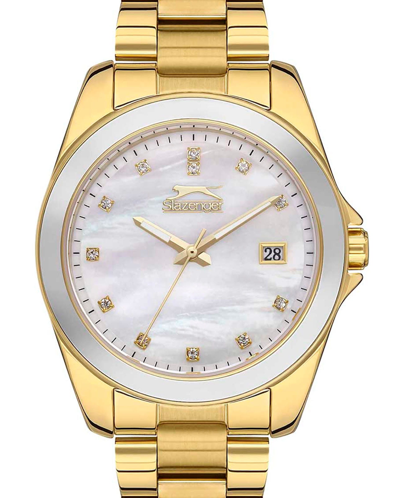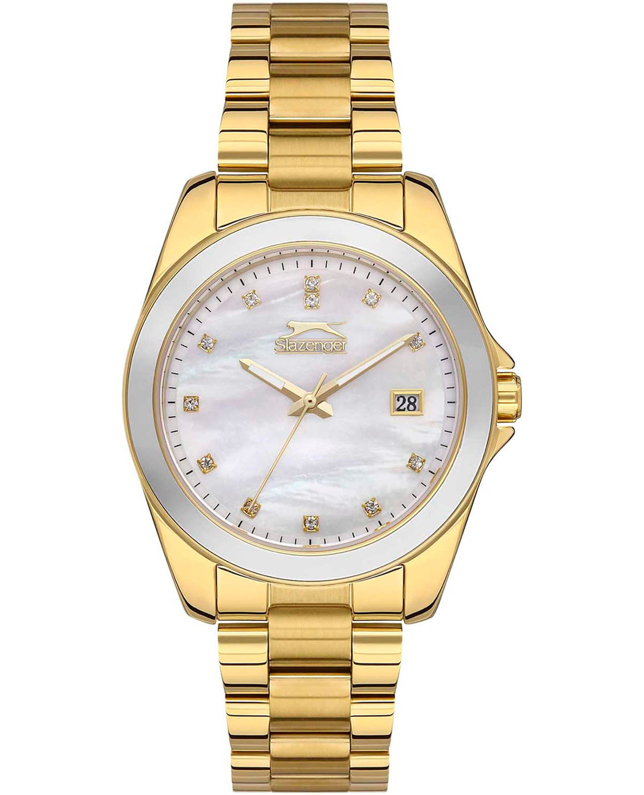 Женские наручные часы Slazenger SL.09.2142.3.05 сочетают в себе элегантный дизайн и надежность современных технологий. Модель обладает круглым корпусом диаметром 37 мм, изготовленным из суперметалла, что обеспечивает высокую устойчивость к внешним воздействиям. Браслет выполнен на раскладной застёжкеРаскладная застёжкаТакой тип застёжки используется только на браслетах из металла. Она никогда не раскрывается полностью, происходит разделение на 2 и более частей. Раскладывающая застёжка снизит вероятность потери часов к минимуму., гарантирует комфортное ношение и безопасность. Циферблат перламутрового цвета декорирован кристаллами и стрелками с люминесцентным покрытиемЛюминесцентное покрытиеПозволяет считывать показания времени в темноте. Производители наносят на стрелки, часовые индексы, безель или поверхность циферблата светонакопительный состав, дающий холодное свечение., которые обеспечивают читаемость времени даже в условиях недостаточной освещенности. Для защиты используется минеральное стеклоМинеральное стеклоМинеральное стекло представляет собой искусственно выращенный минерал кварца. Такое стекло отличается особой устойчивостью к повреждениям и царапинам. Уступает по некоторым качествам сапфировому стеклу., обеспечивающее прочную защиту от царапин. Браслет и корпус часов из суперметалла с IP-покрытиемIP-покрытиеМетод ионного напыления. Демонстрирует повышенную устойчивость к истиранию, окислению и химическим веществам. Под воздействием высокого давления и температуры около 1500°C молекулы металла надёжно соединяются с частицами корпуса часов.. Часы работают на кварцевом механизме, что гарантирует точное время без необходимости подзаводки. Модель также оснащена функцией отображения даты, делая ее практичной для повседневного использования. Водонепроницаемость часов достигает 50 атмосфер , что позволяет использовать их во время плавания, однако не рекомендуется для дайвинга или других водных видов спорта.
